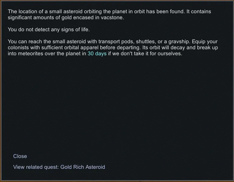 This adds a Asteroid Mineral Scanner building that allows you to search for rich asteroids in a specific resource in orbit as an alternative to the vanilla long-range mineral scanner on the surface. You may find slightly more resources in comparison in addition to small amounts of vacstone for the additional fuel and labor effort of going to orbit.