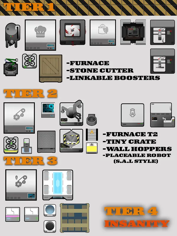 This adds new Factorio like buildings that has a Input and a Output and will work be them self if you supply resources.