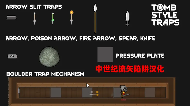 Tomb Traps的汉化。 添加了几种中世纪的简单陷阱。在“防卫”板块中选用建造即可。 需要先完成原版【反曲弓】研究项目才可以建造。