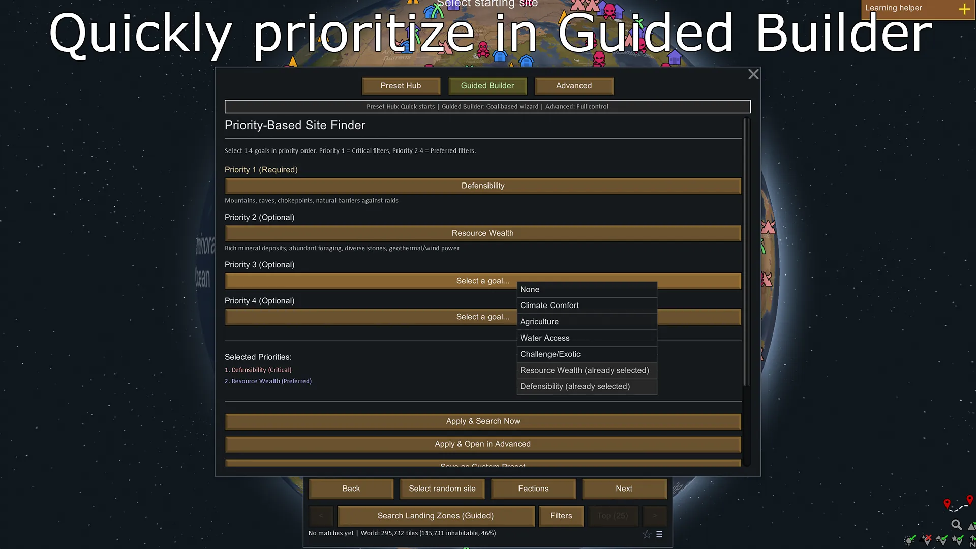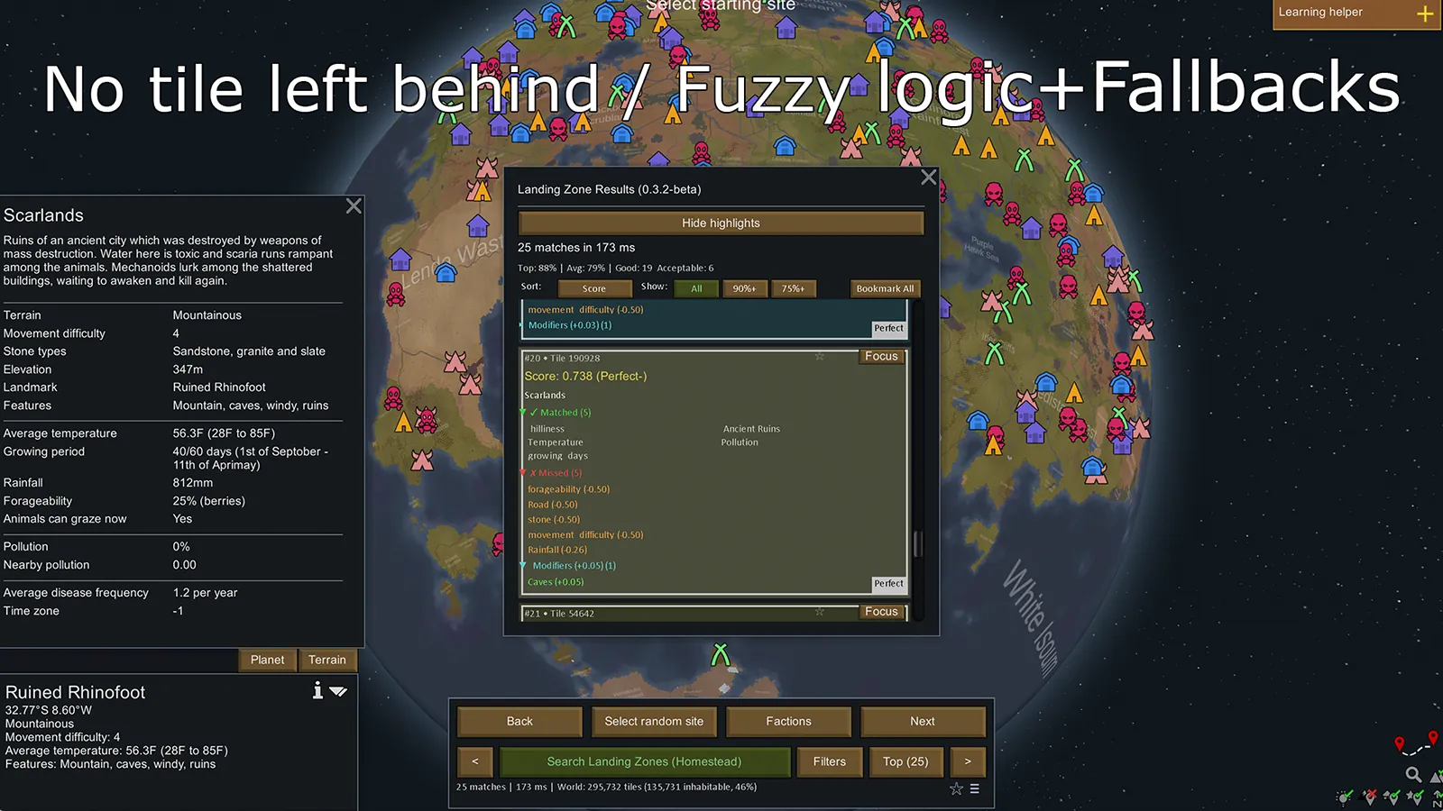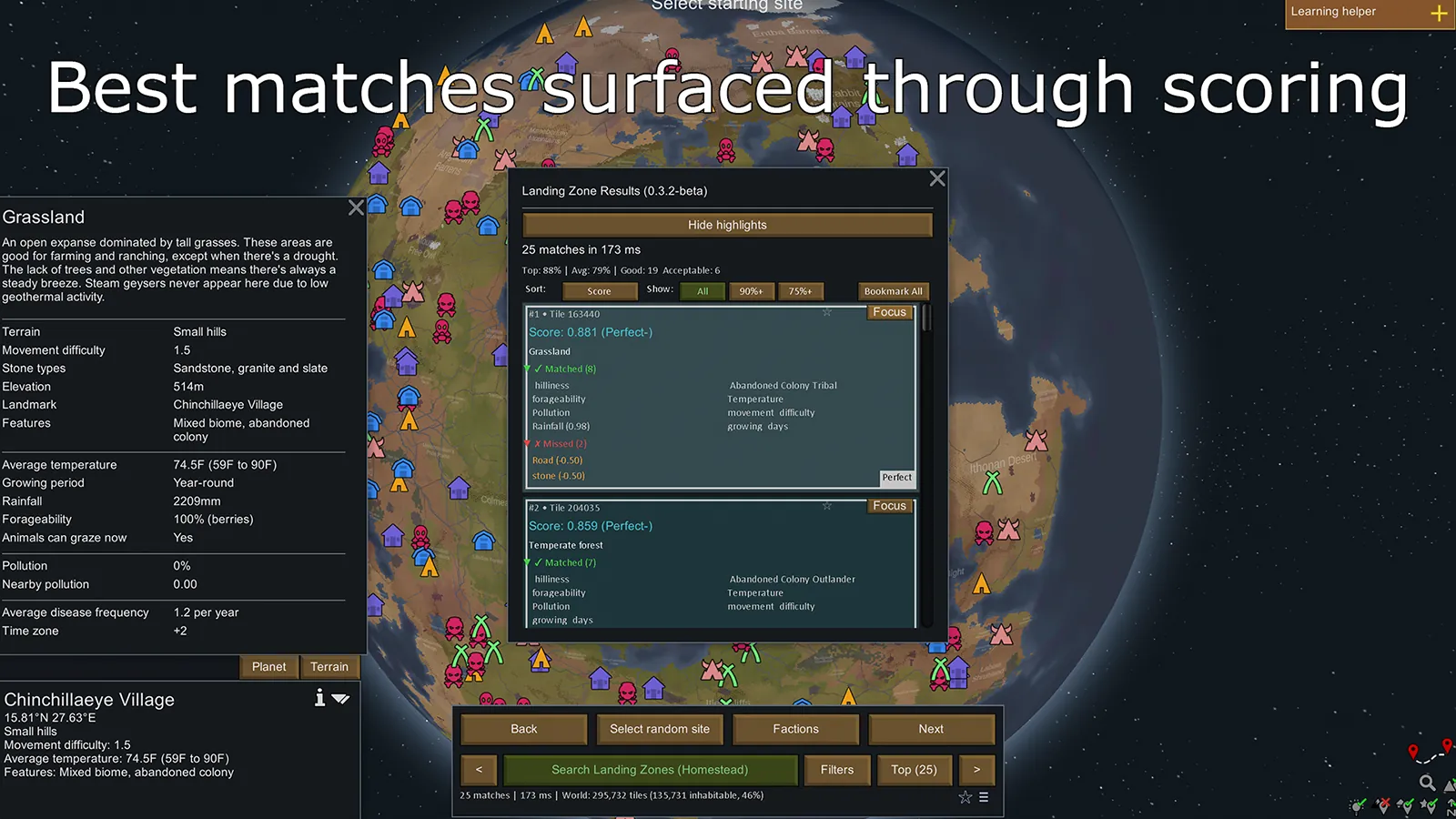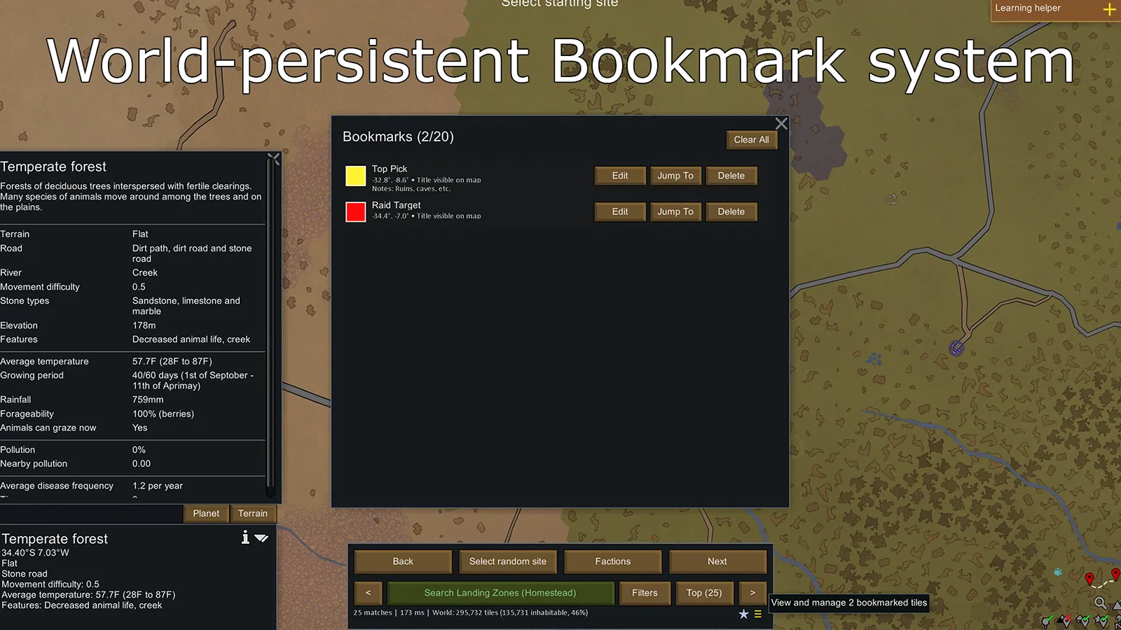 LandingZone helps you find the perfect settlement location by filtering world tiles based on climate, terrain, resources, and geographic features.