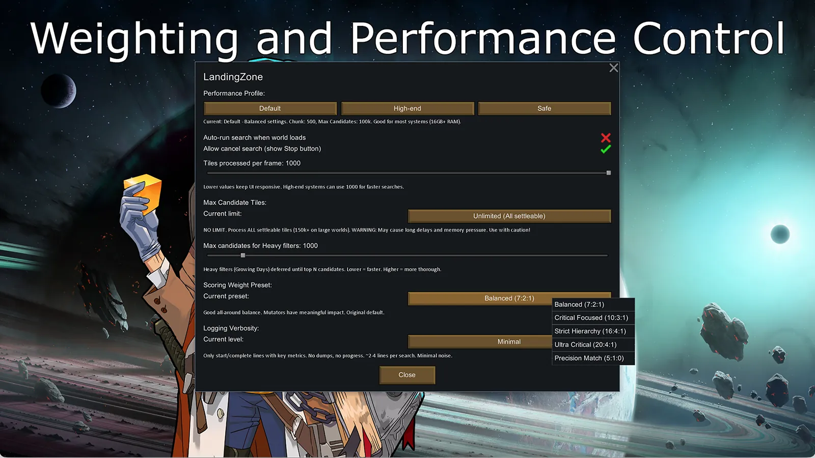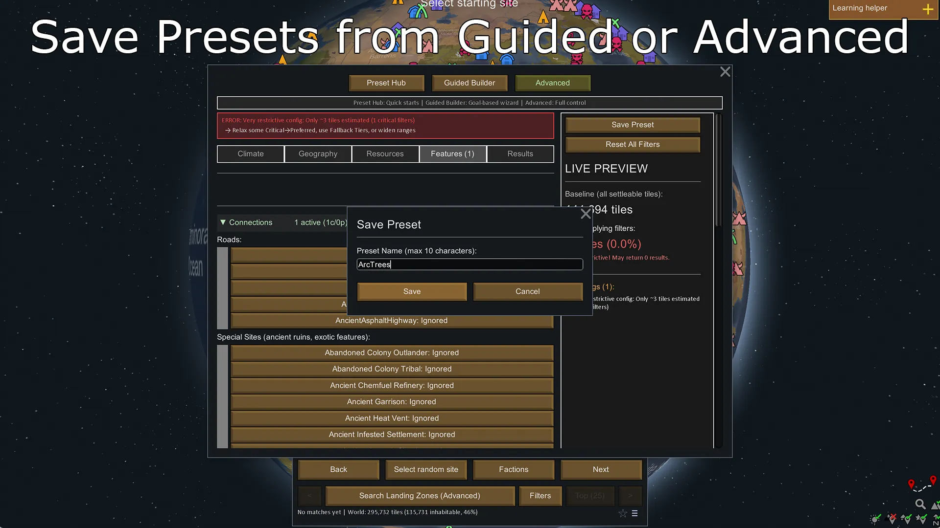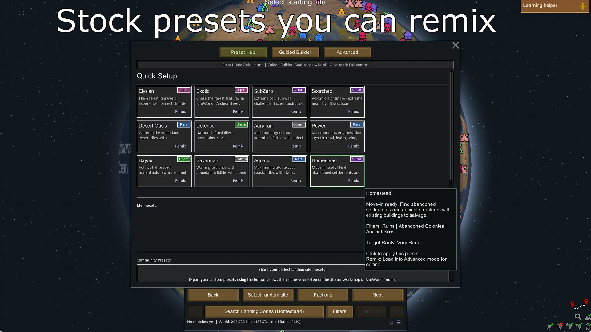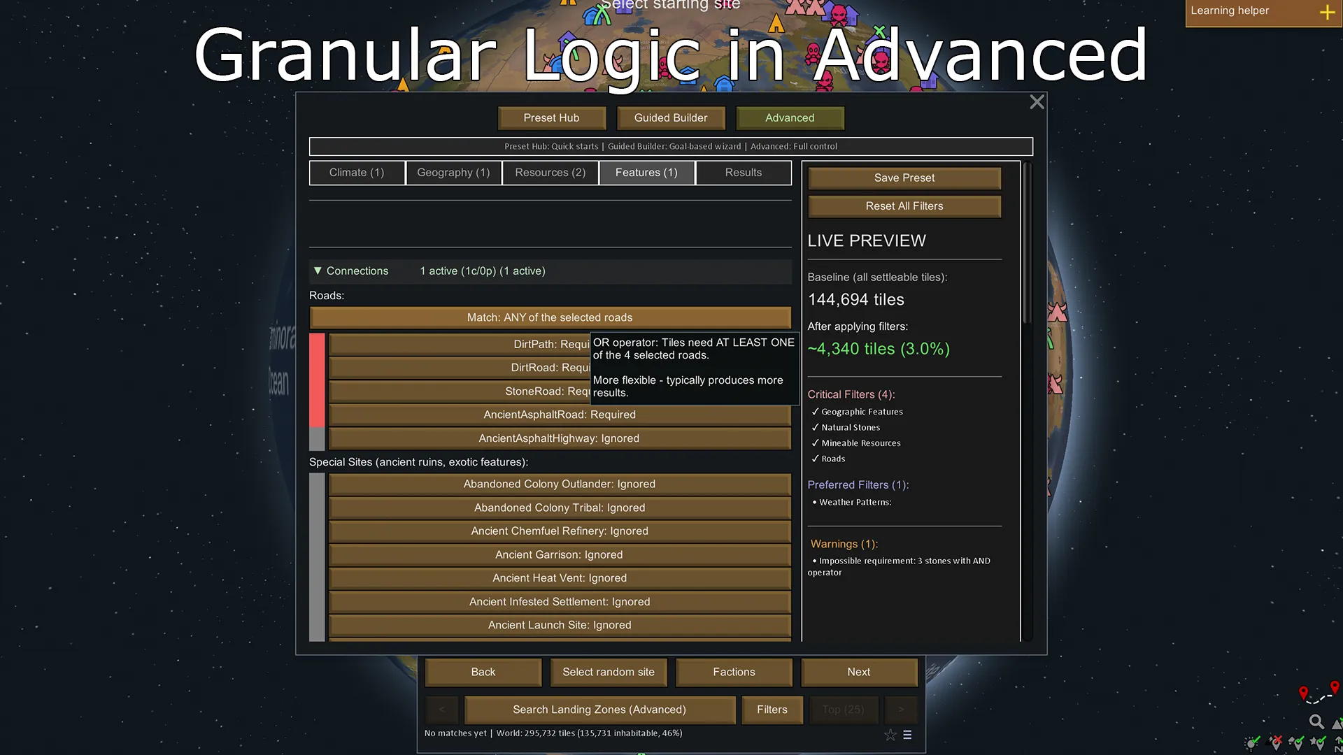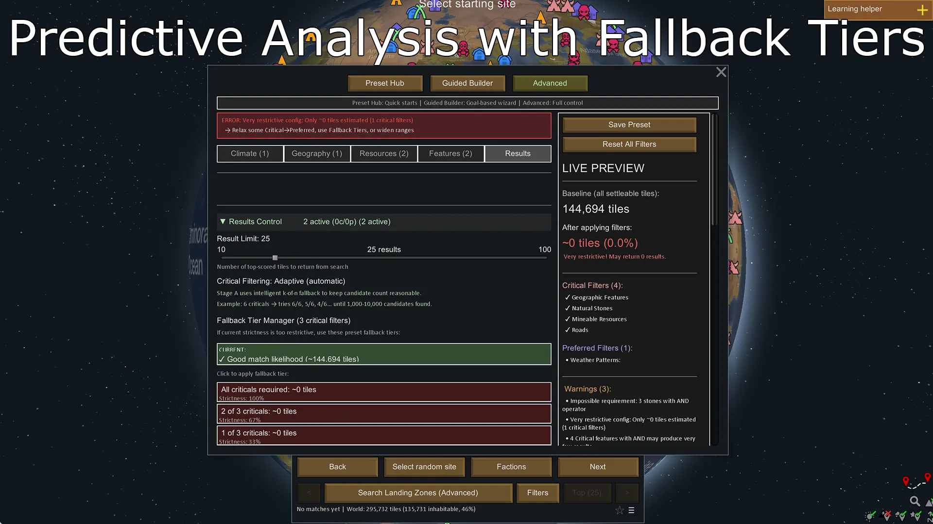 LandingZone helps you find the perfect settlement location by filtering world tiles based on climate, terrain, resources, and geographic features.