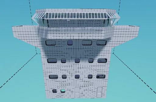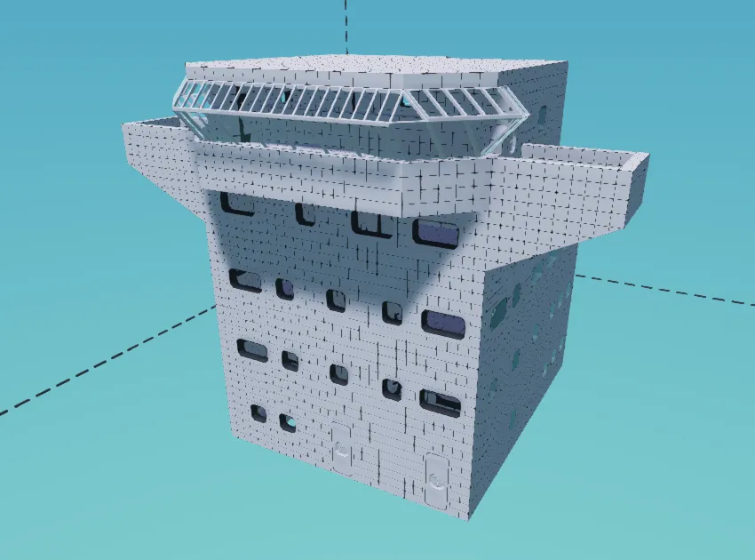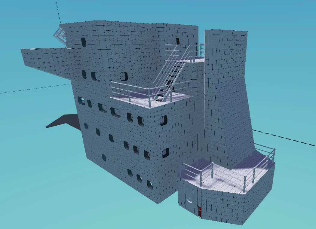Es ist bis auf ein paar Feuerlöscher und Medikits komplett leer. Lediglich die Treppen, Türen und ein kleiner Teil der Brücke sind erbaut. Fühl dich frei dies zu verwenden und es auf dein Schiff zu bauen!