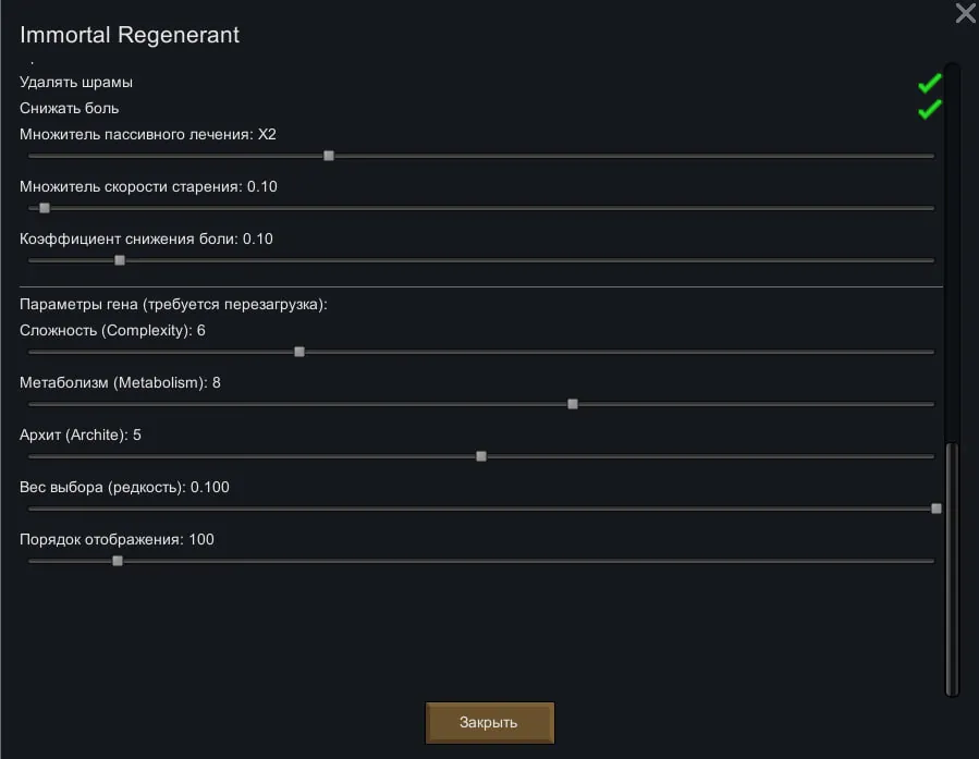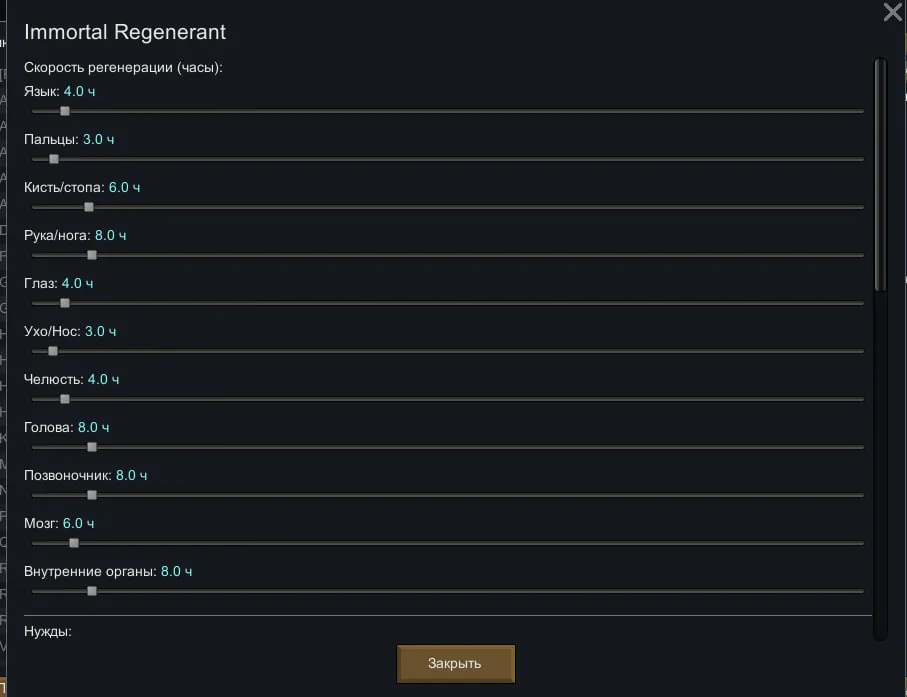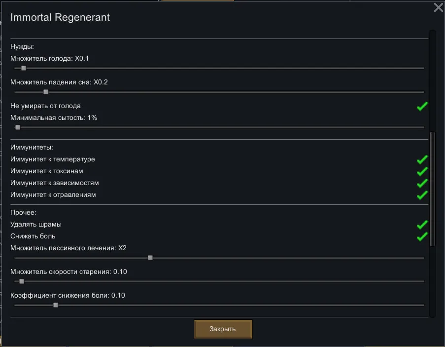 Even while dead, the pawn continues to regenerate wounds and limbs. Unlike vanilla immortality with a coma timer, the pawn stands up as soon as key organs are restored.