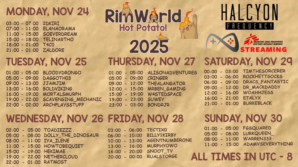 This is the starting scenario for the 2025 RimWorld Hot Potato charity event. Raising money for Doctors without Borders, we will be building a charitable/helpful colony focused on giving medical care to people in need. While the ideology will be tunneler, the founding colonists are also passionate about clean, renewable energy sources and will not use chemfuel or wood generators for power.