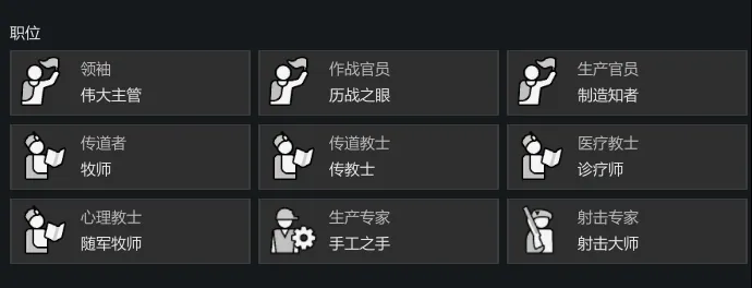 • 心理教士 - 心理健康顾问,帮助维持殖民者的稳定状态 - 可以使用劝慰