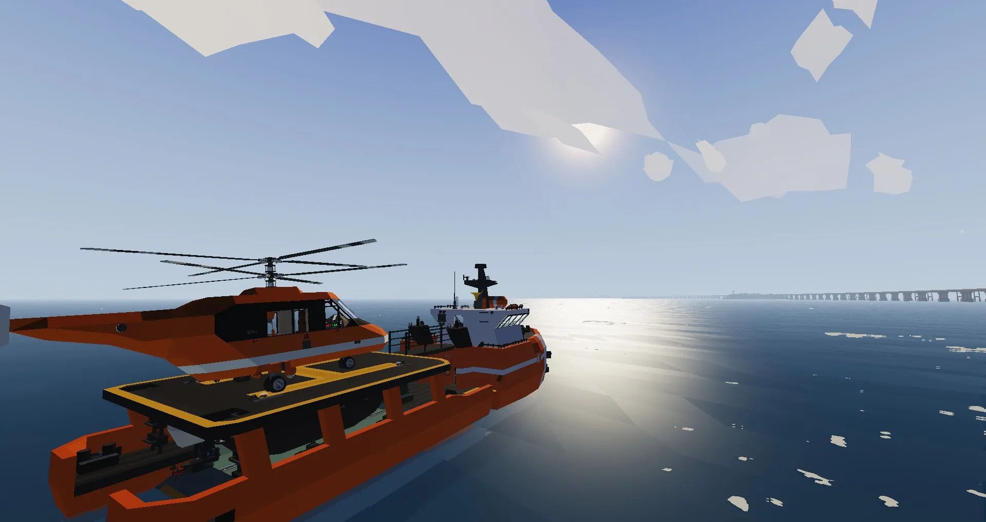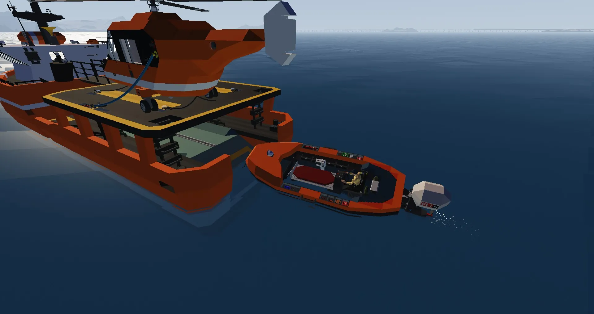 a helicopter and has a small rescue boat for picking up people in water.