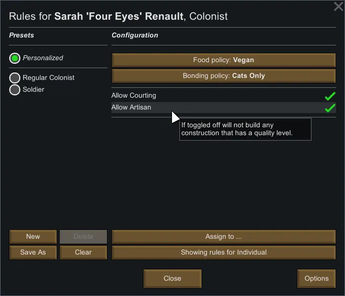 [b]Pawn Rules[/b] is a mod that allows custom rules to be assigned individually to your colonists, animals, guests and prisoners. Default rules can be set for new pawns and new born animals will inherit their mother's rules.