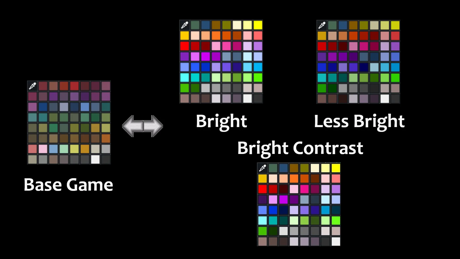 A ninth option, created for use with [url=https://steamcommunity.com/sharedfiles/filedetails/?id=852103845]Extra Stone[/url], is not designed to be switchable. It consists of the colors of all the added stone types plus one shade, lighter or darker, for each. The colors of vanilla stones are added as well, though without any shades (see style Vanilla Plus for that). The colors in this palette are labeled with the names of the stone types. You can technically make a style switch with this palette, but the color changes will probably be charmingly eccentric.