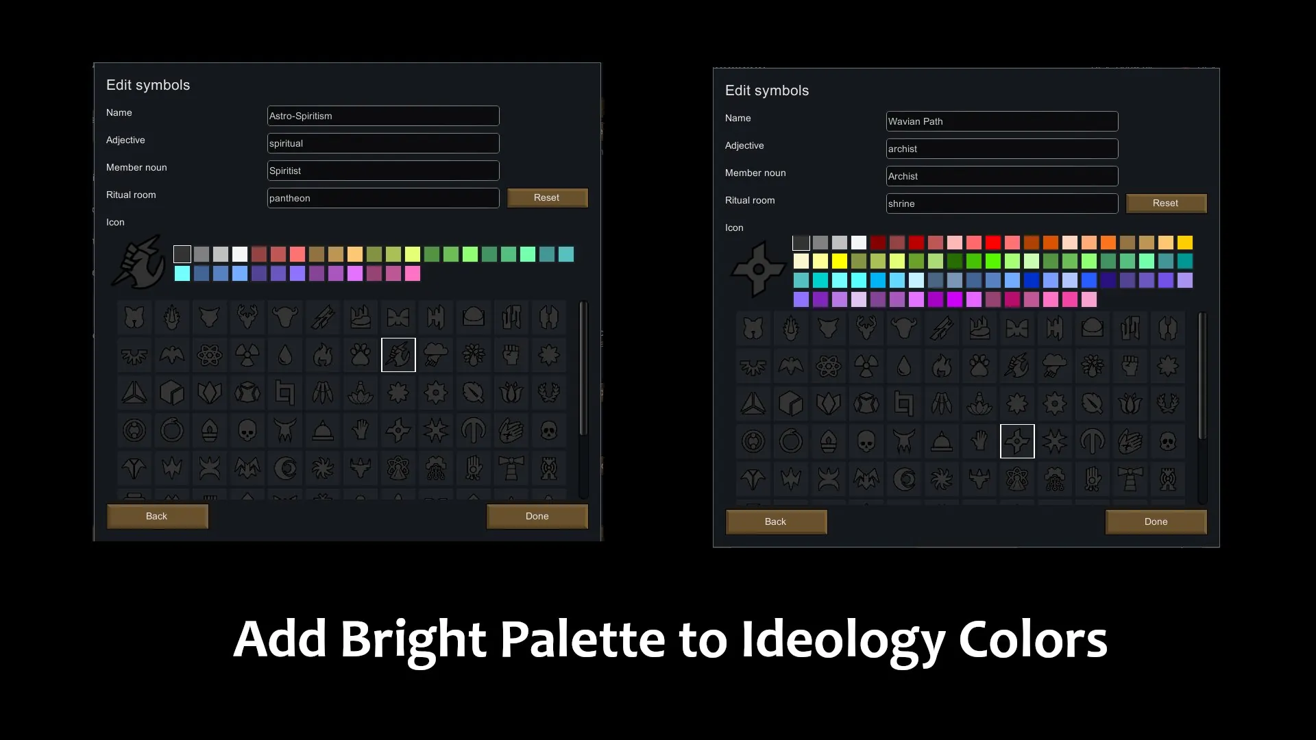 Persisting issue: No changes are made to the UI, so it is possible that added ideology colors are cut off in a menu, because the space isn't sufficient to display them all. This also affects other mods making use of colors, such as [url=https://steamcommunity.com/sharedfiles/filedetails/?id=1687053679]Gradient Hair[/url].