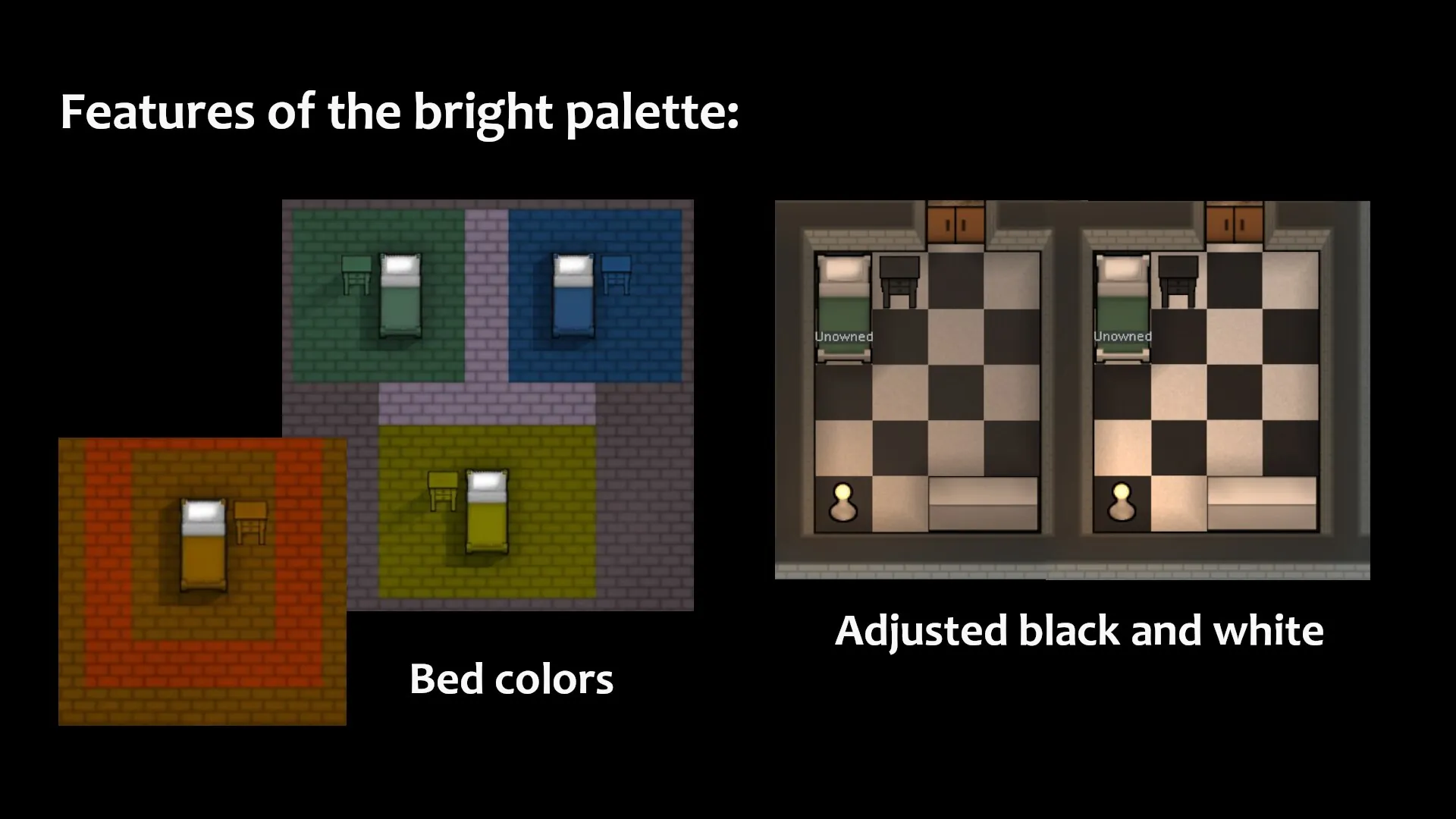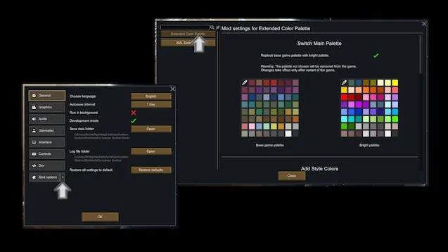 If you switch from the original mod with an existing save that uses one of the bright palettes, all of those colors (your carpets and paint on objects) will vanish.