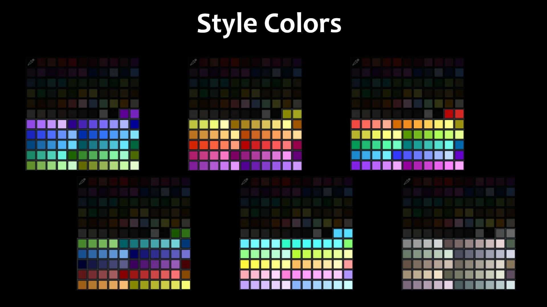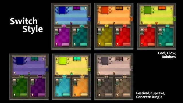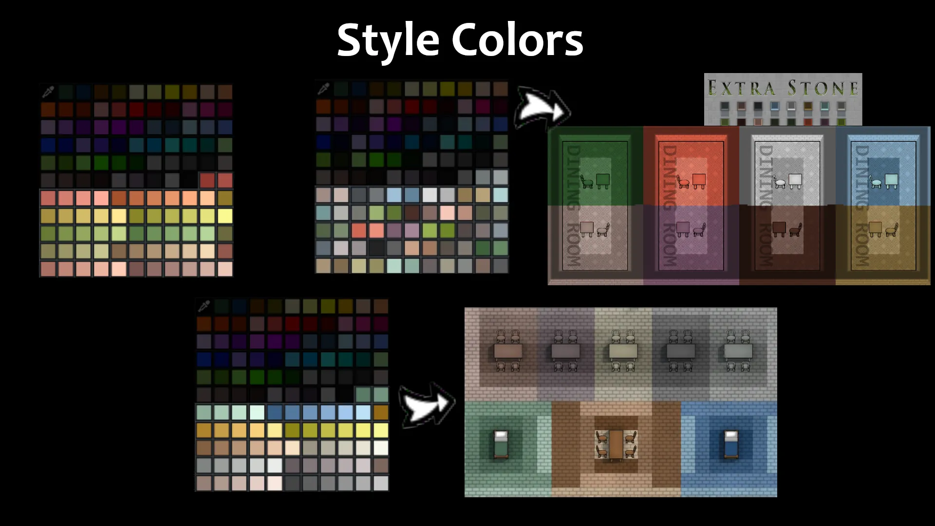 If you switch between styles for an existing save, you can consistently change the appearance of all painted buildings, floors and carpets of your base in one step, provided you used the style colors for them. Colors from the main palette (vanilla or from this mod) are not affected by a style switch. The colors white and black are reordered to be the last in the main palette, so you can easily identify where the style colors start. (Though the carpet palette sorts differently.)