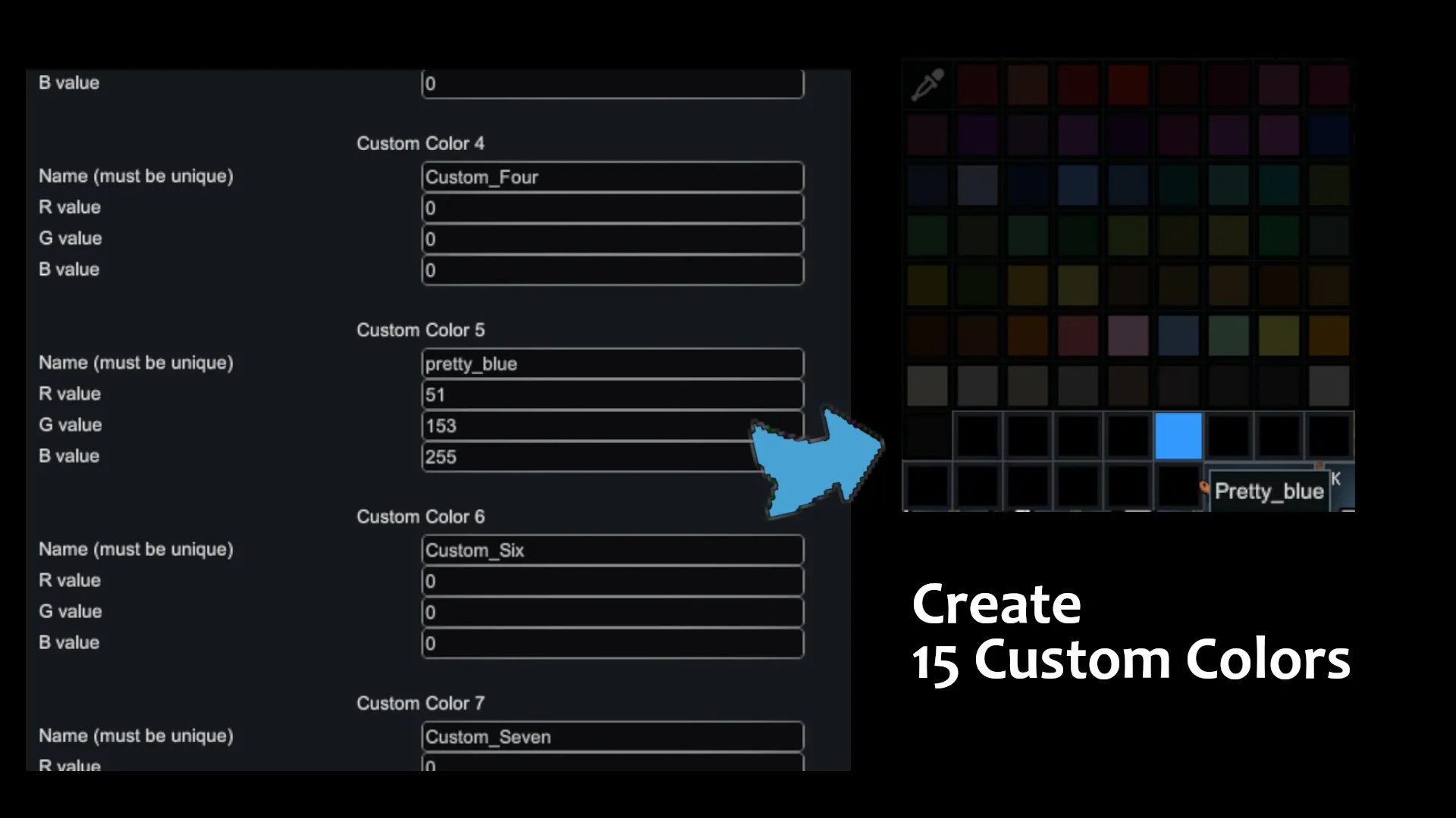 To add your own custom colors, you need to know their RGB values (RGB meaning red/green/blue). You can look those up on the web. The values must be between 0 and 255. The name you choose for your color must be unique and not contain any numbers or spaces. If you want to change a custom color that you've already used in your existing save, you can do that as long as the name remains the same. The paint (or carpet) will still be there and change its color according to your new RGB values.