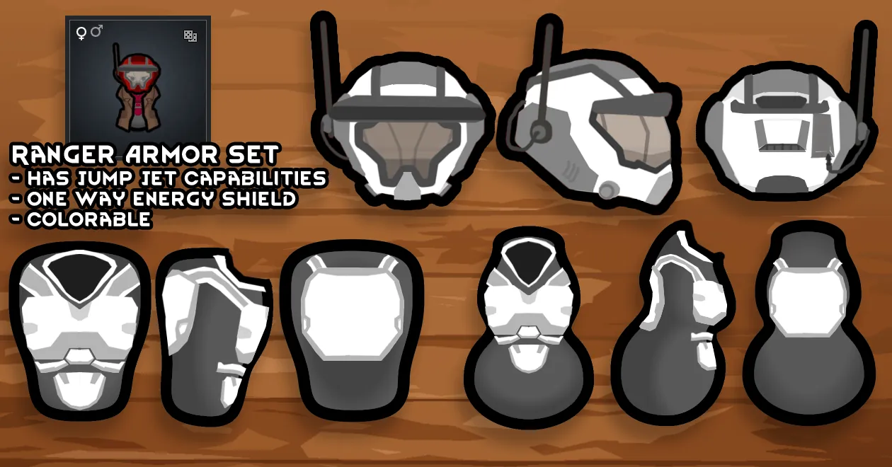- Ranger Armor, colorable in style of vanilla spacer armors. Requires chemfuel to fly, has energy shielding.