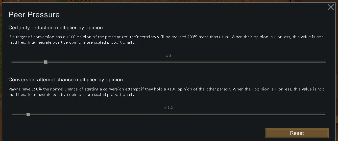 With this mod, converting pawns to another ideology becomes more effective when they have a positive opinion of the proselytizer. Likewise, pawns are more likely to try to convert other pawns if they have a positive opinion of them. Shape the beliefs of your colony with ease!