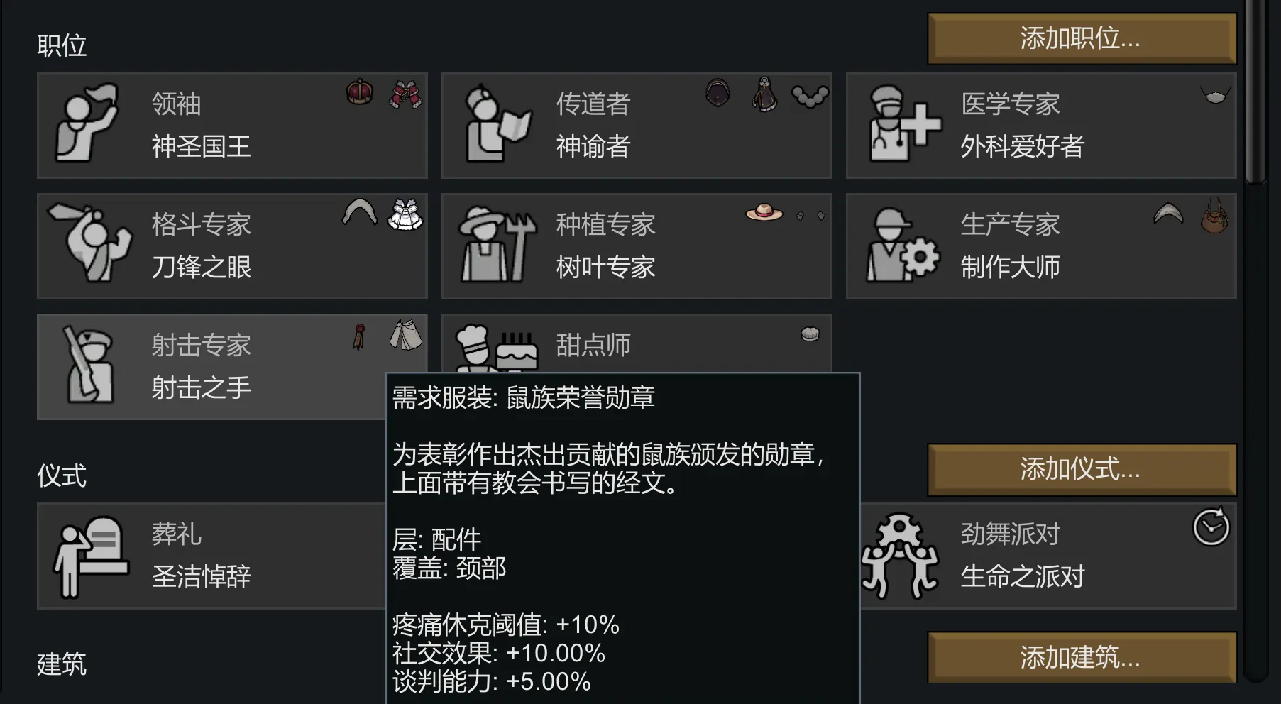 让鼠族服饰在文化职位中可用。如原版一样,所有职位都共享一些通用的服饰,而每种职位也都有一两种专属服饰。鼠族服饰仅拥有鼠族文化的派系可用。