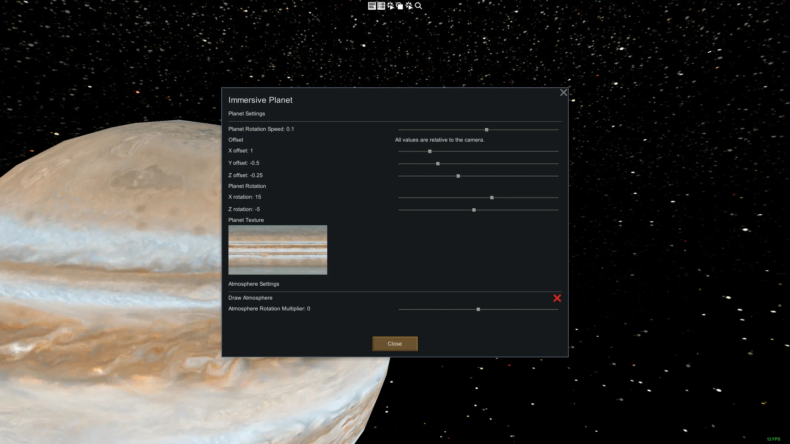 While I failed to fulfil the objective I had in mind, I'm content with what I've made and I'm looking forward to continuing this mod. For now, I'm leaving this version as a "proof of concept" but I'll gladly add more features in the near future. Besides custom textures and a variable spin rate, or maybe even a ship model orbiting the planet, I'm also open to your suggestions of what could possibly be added.