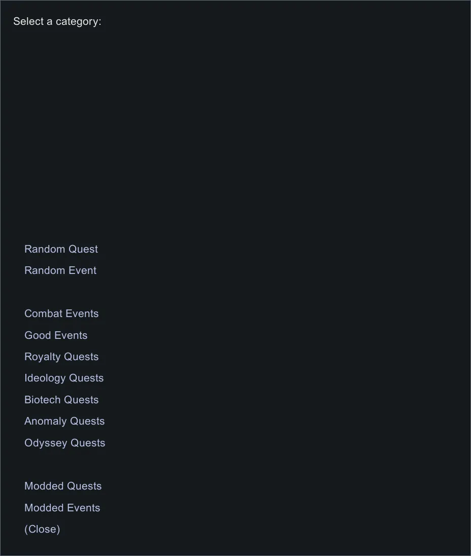 [*] Automatically scans your mods, and if the mods use either QuestScriptDefs or IncidentDefs, they will be added to the Modded categories.