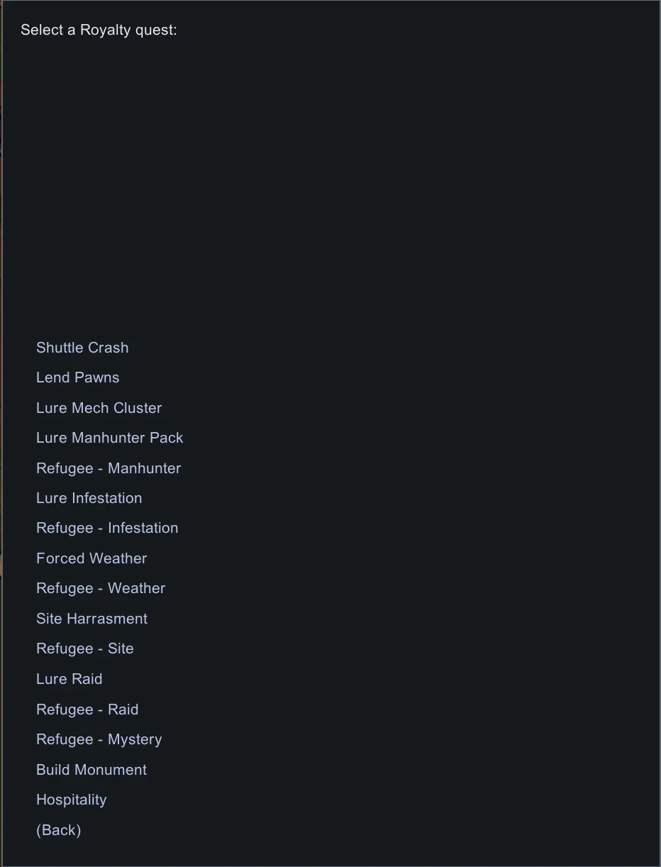 Adds a simple Mission Board which lets you manually select and activate quests and events. No more waiting around for the Storyteller to give you events, easily choose the events that you want, whether you want combat, visitors, DLC, or modded quests.