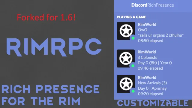 Fork Page github: [url=https://steamcommunity.com/linkfilter/?u=https%3A%2F%2Fgithub.com%2Flunaberryyyy%2FRimWorldRPC]https://github.com/lunaberryyyy/RimWorldRPC[/url]