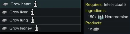 Adds recipes for organs in the fabrication bench when advanced fabrication is researched. all organs take 150 neutroamine to create and require intellectual skill 8.