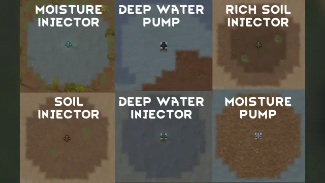 [*] Each device covers its 6.9 tile radius in 20 days (instead of the vanilla 60 days) but power requirement is scaled to be three times than the vanilla moisture pump electricity requirement (i.e. time to radius went from 60 to 20 and required power went from 150 to 450).