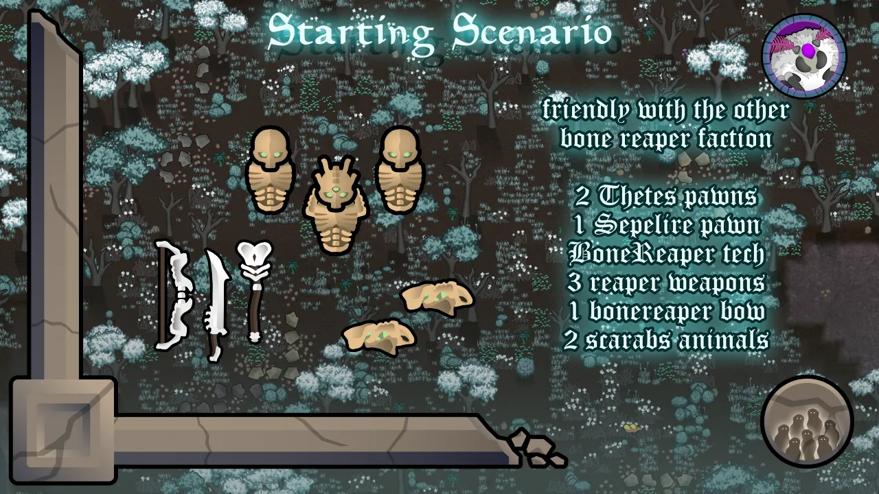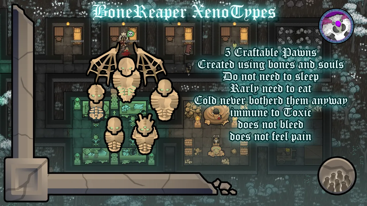 The best way to use this mod though is to BE the BoneReapers and enjoy the greater things in death. As a bone reaper, you will be harvesting the rimworld for bones and souls to make the most splendid colony that only the dead can truly appreciate. Which they should appreciate since the whole colony was made FROM them, truly the greatest form of recycling.