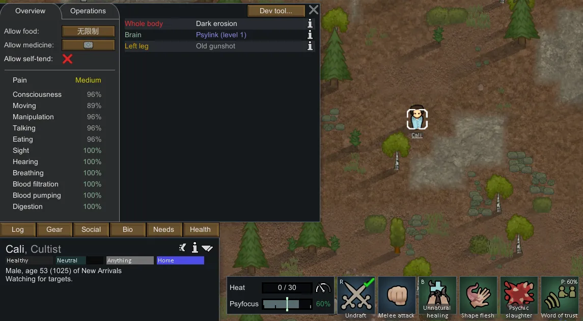 同时本Mod还增加一个无法治愈且基于已学会的异常技能数量增长的健康状态——暗黑侵蚀,当小人学习第二个异常技能时就会自动获得该健康状态并造成+10%的疼痛,并且每多学会一个异常技能就会额外增加10%疼痛。