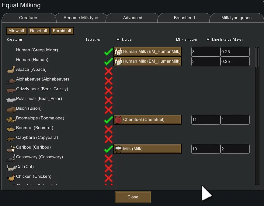 [*] Allow animals to breastfeed animals. You can also enable breast feed among humans, animals, mechanoids
