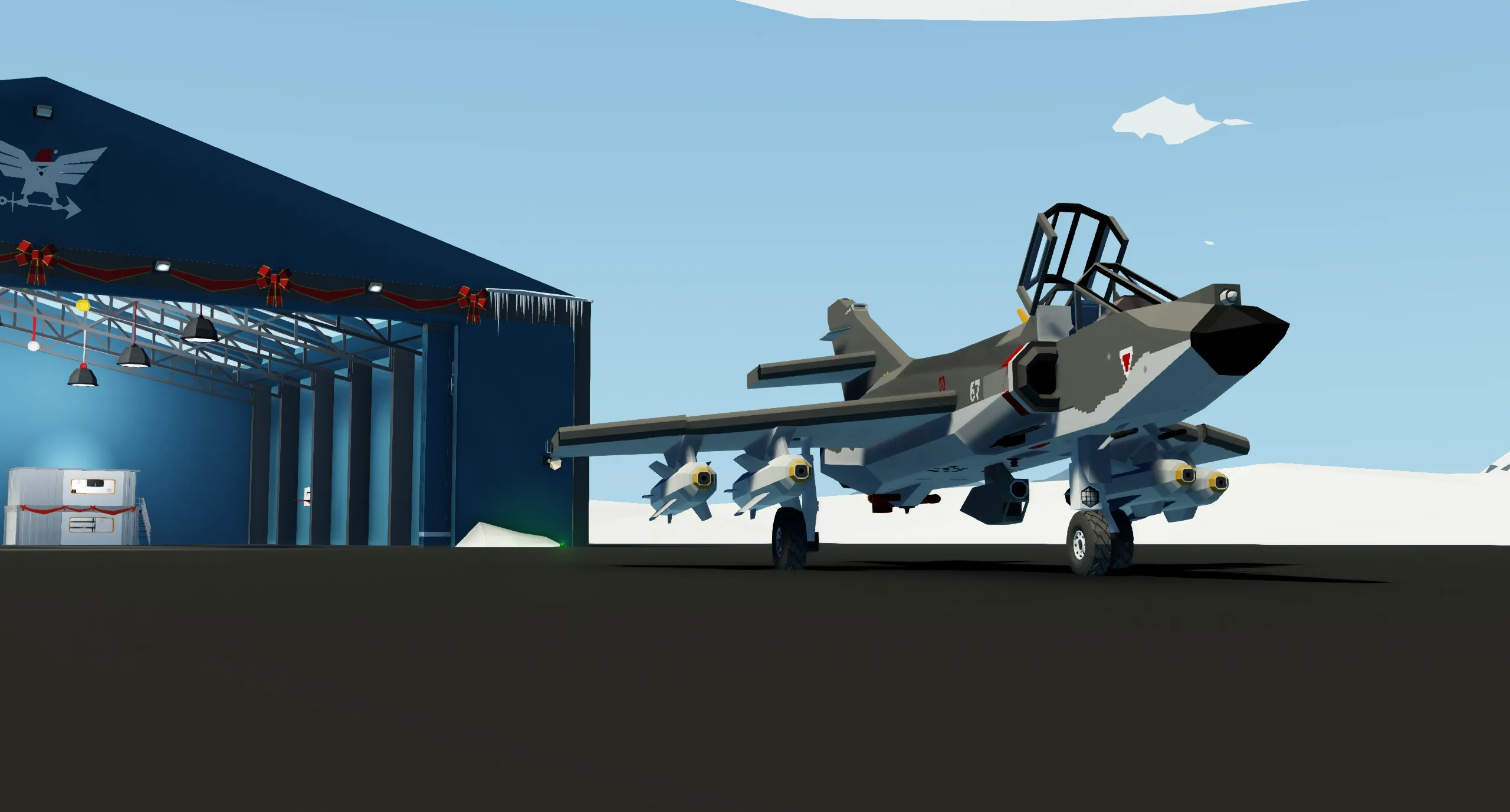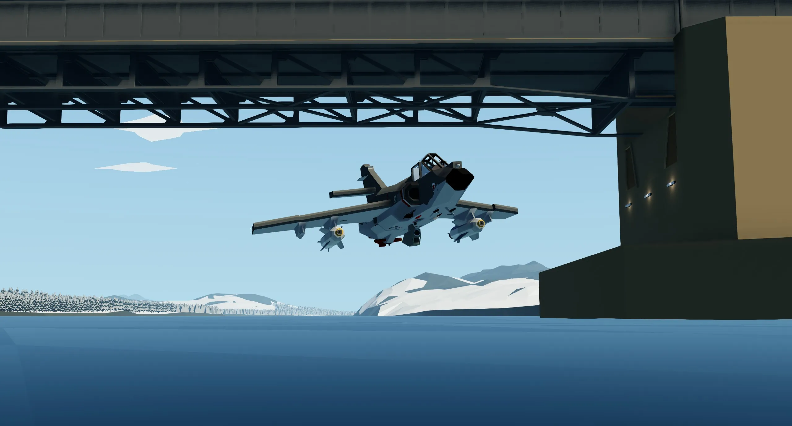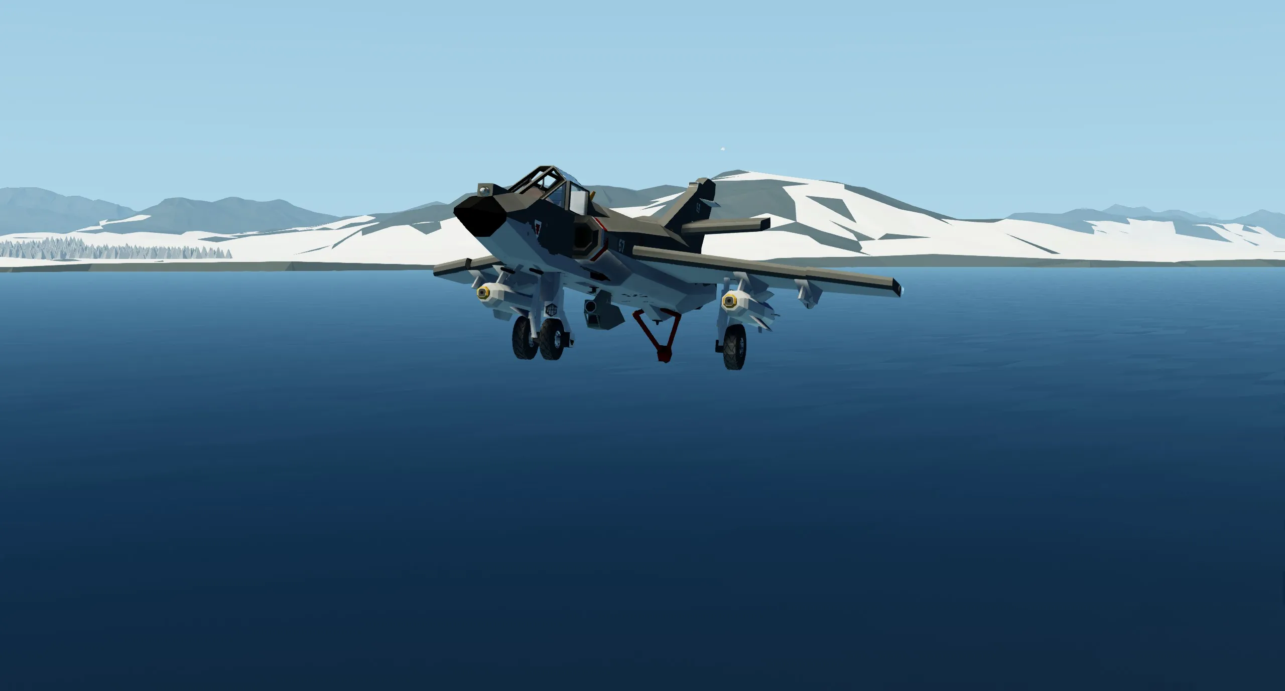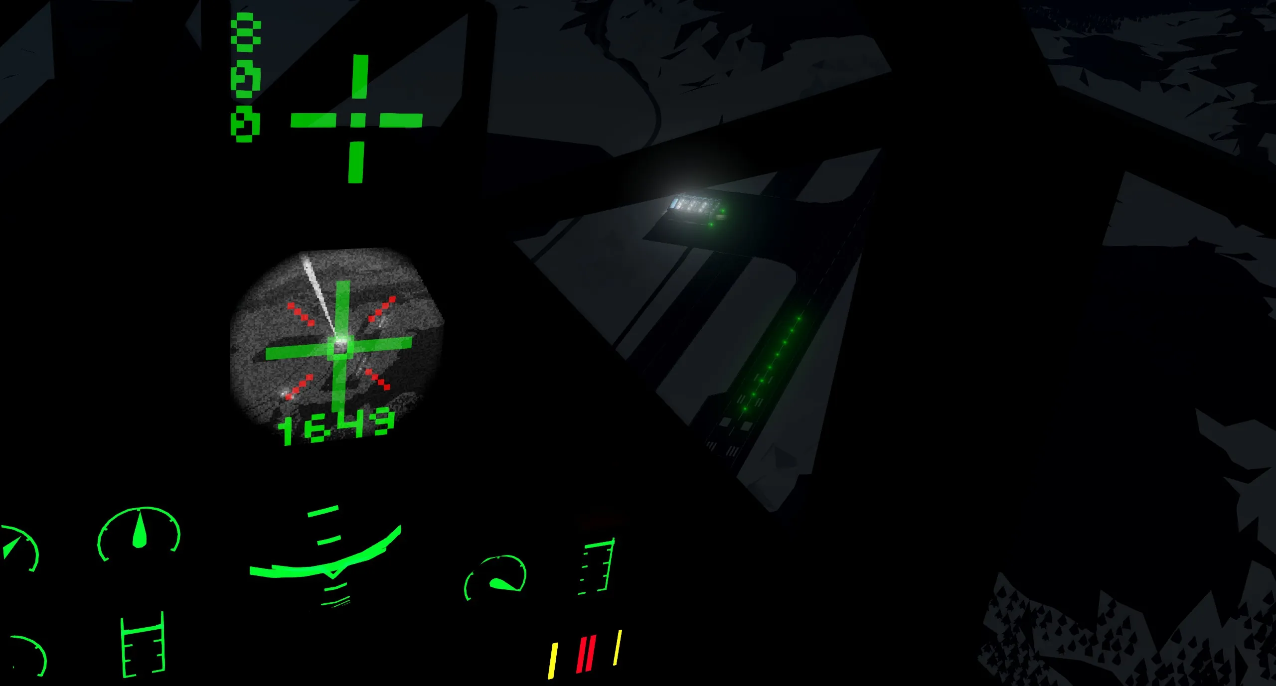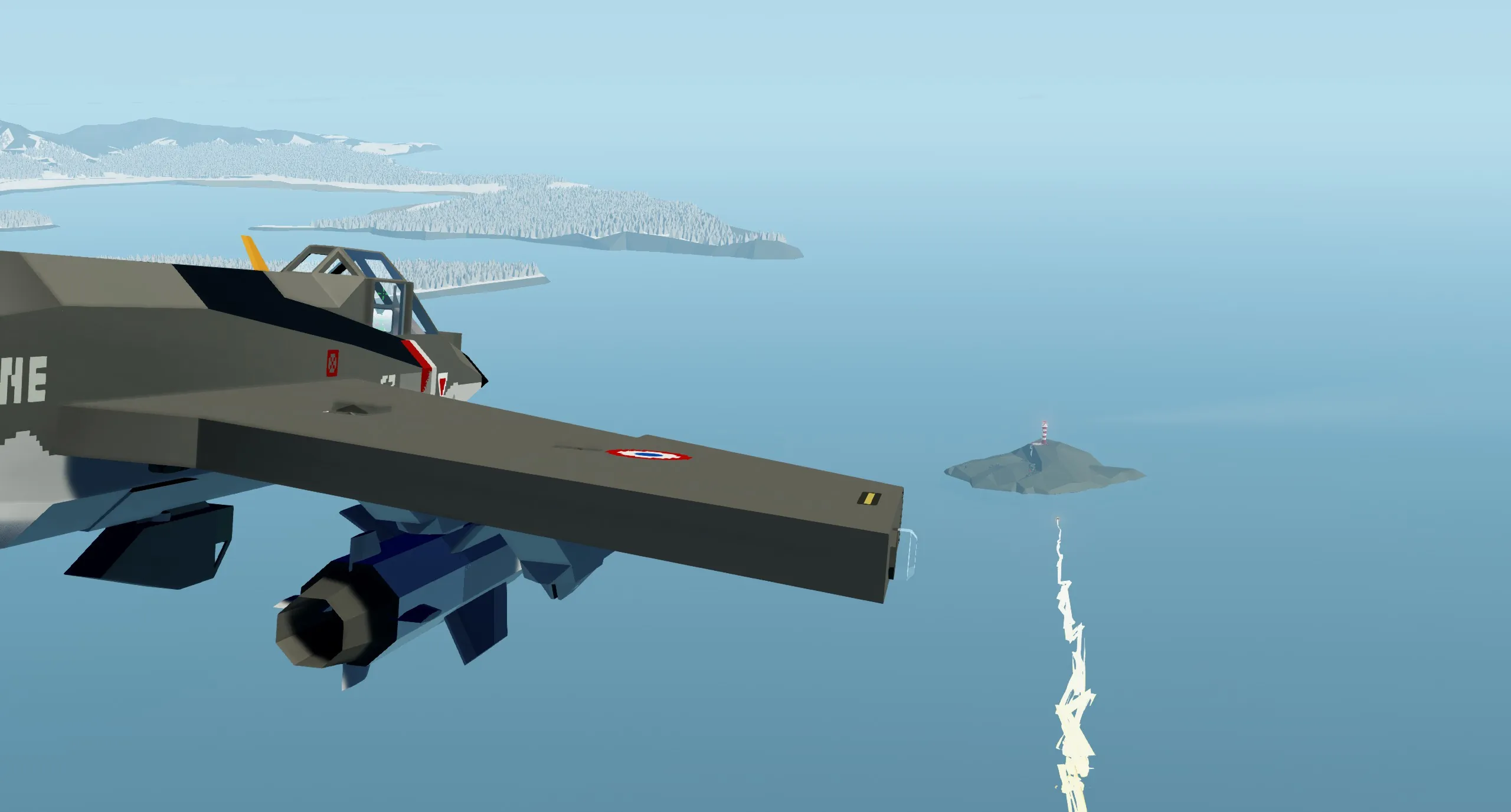 The aircraft's main armament are the four AS.30L air-to-ground missiles mounted under the wings. In Stormworks, warheads are pretty general purpose so you can use these against basically any target. To guide these, a laser targeting pod comes attached to the aircraft. The laser, when unlocked, follows the player's mouse (it points at wherever you look). However, you can also lock points on the ground by looking at them and pressing "4"; the laser and camera will then follow this point as you fly, and the missile will fly towards this point. You can also see where the laser is pointing on the MFD. It has a 90 by 90 degree forward field of view.