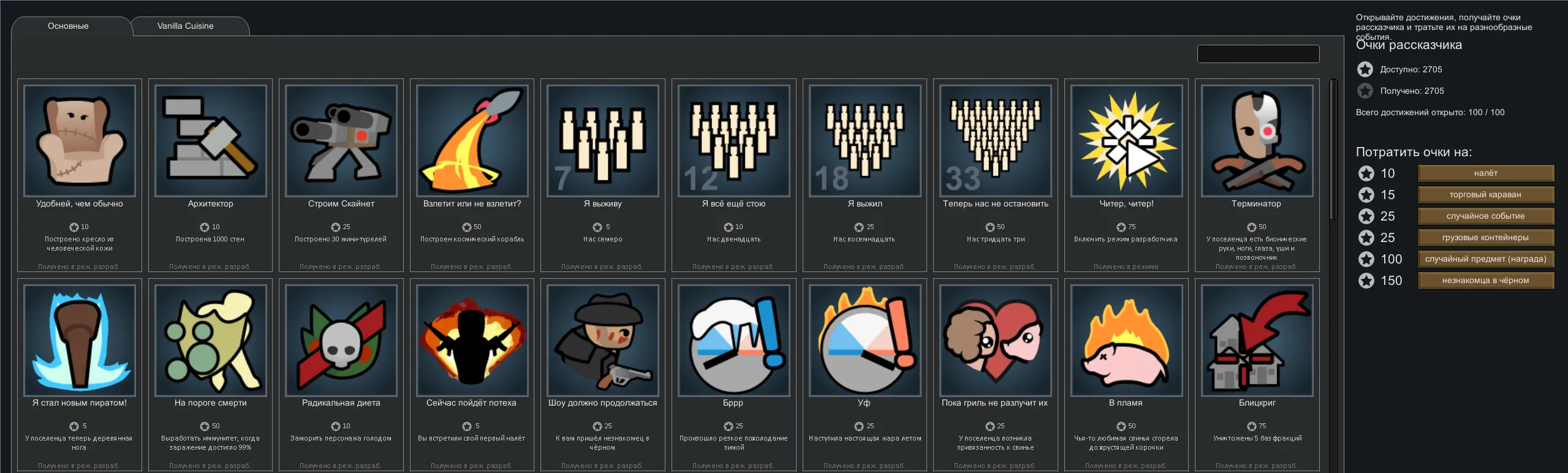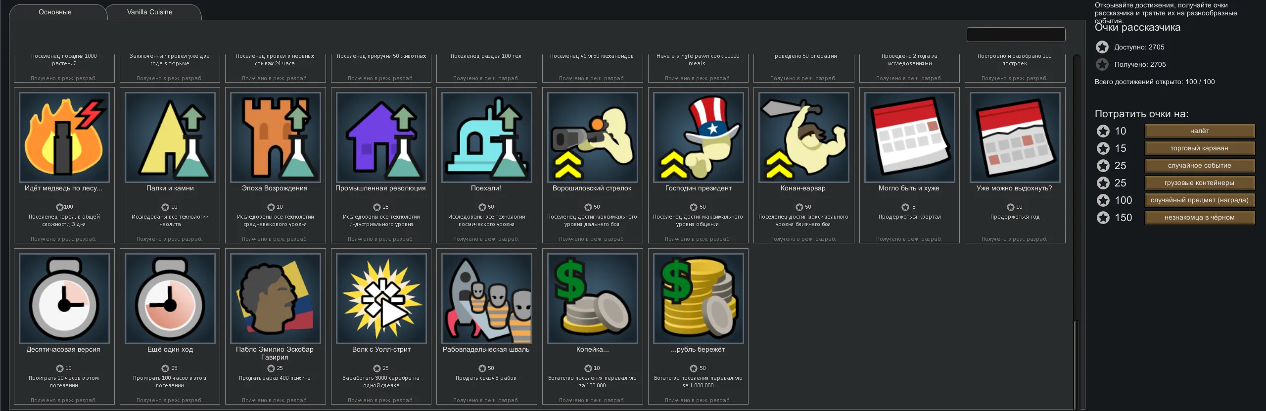 Vanilla Achievements Expanded добавляет в игру долгожданную систему достижений. Выполняя их, вы будете видеть всплывающие окна, как в Steam, и получать специальные «очки рассказчика», позволяющие вызывать некоторые события.