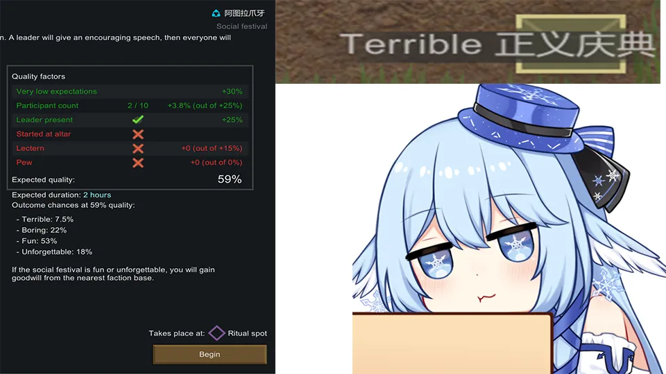 Why the outcome of a 59% ritual could be terrible with only 7.5% terrible chance? Why you should do saving and loading all the time? They should not happen on Jonouchi of Rimworld!