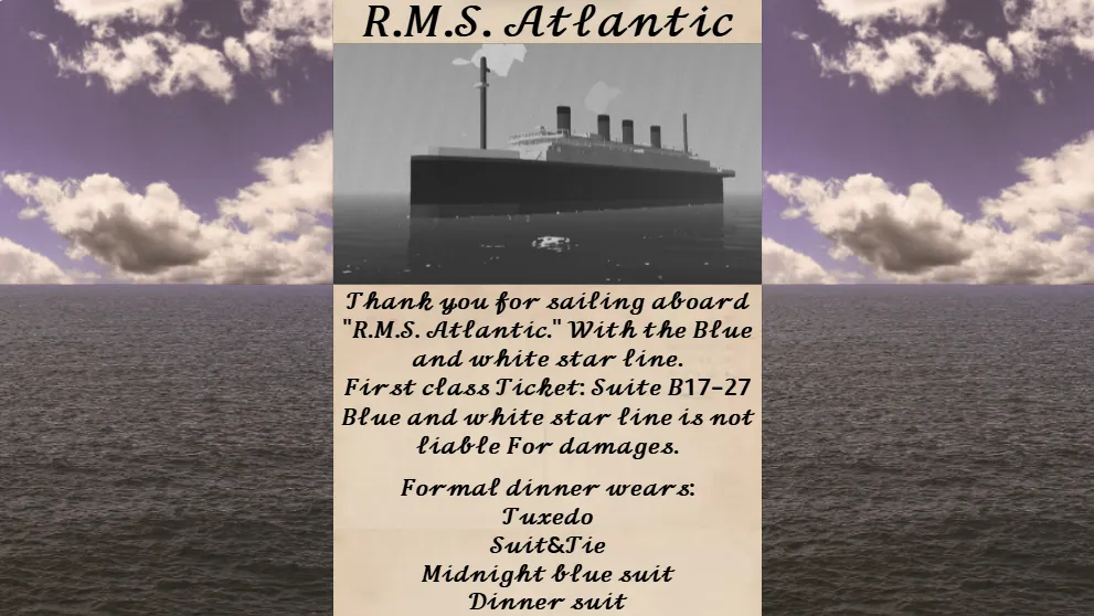 (RMS ATLANTIC IS A FICTIONAL SHIP) RMS Atlantic was built in 1912 For Blue and white star line by harland and wolff shipyards, She served for 30 years, But 30 years after being made, She sank. Rquirements: Infinite electric ON Engine overheating OFF Infinite fuel ON