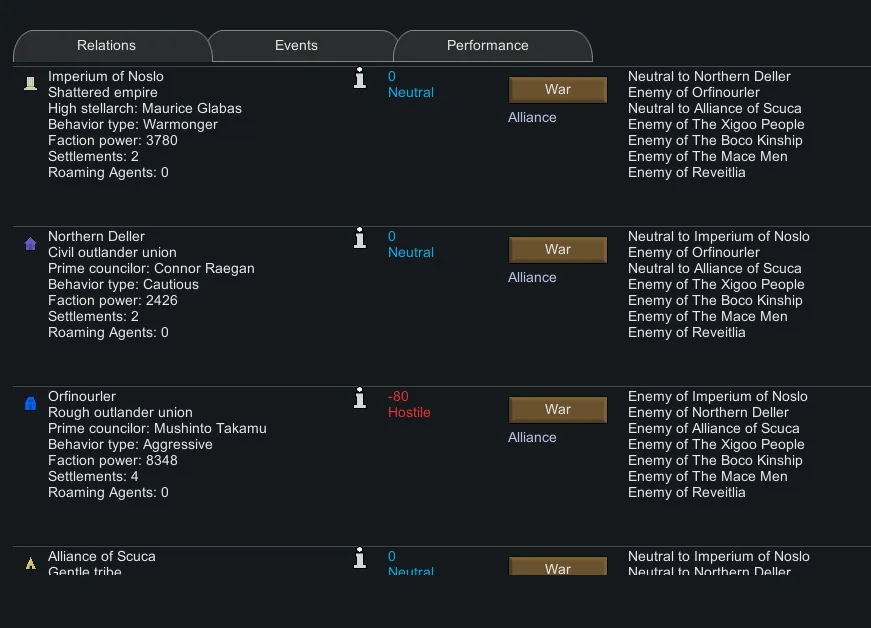 - All factions are assigned a behavior (Warmonger, Aggressive, Cautious, Merchant, Expansionist) and will focus on actions that compliment their behavior