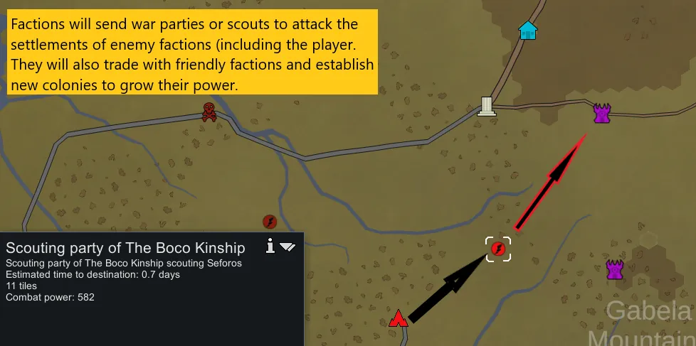 Armies (warbands and scouting parties), settlers, and caravans for all factions can now be seen on the world map and will have practical purposes, destinations, and associated events. Existing events such as raids, trader caravans and more are all generated by AI action and represented as an icon on the map. The more combat power a settlement has, the more difficult raids or wealthy caravans a faction settlement can generate.
