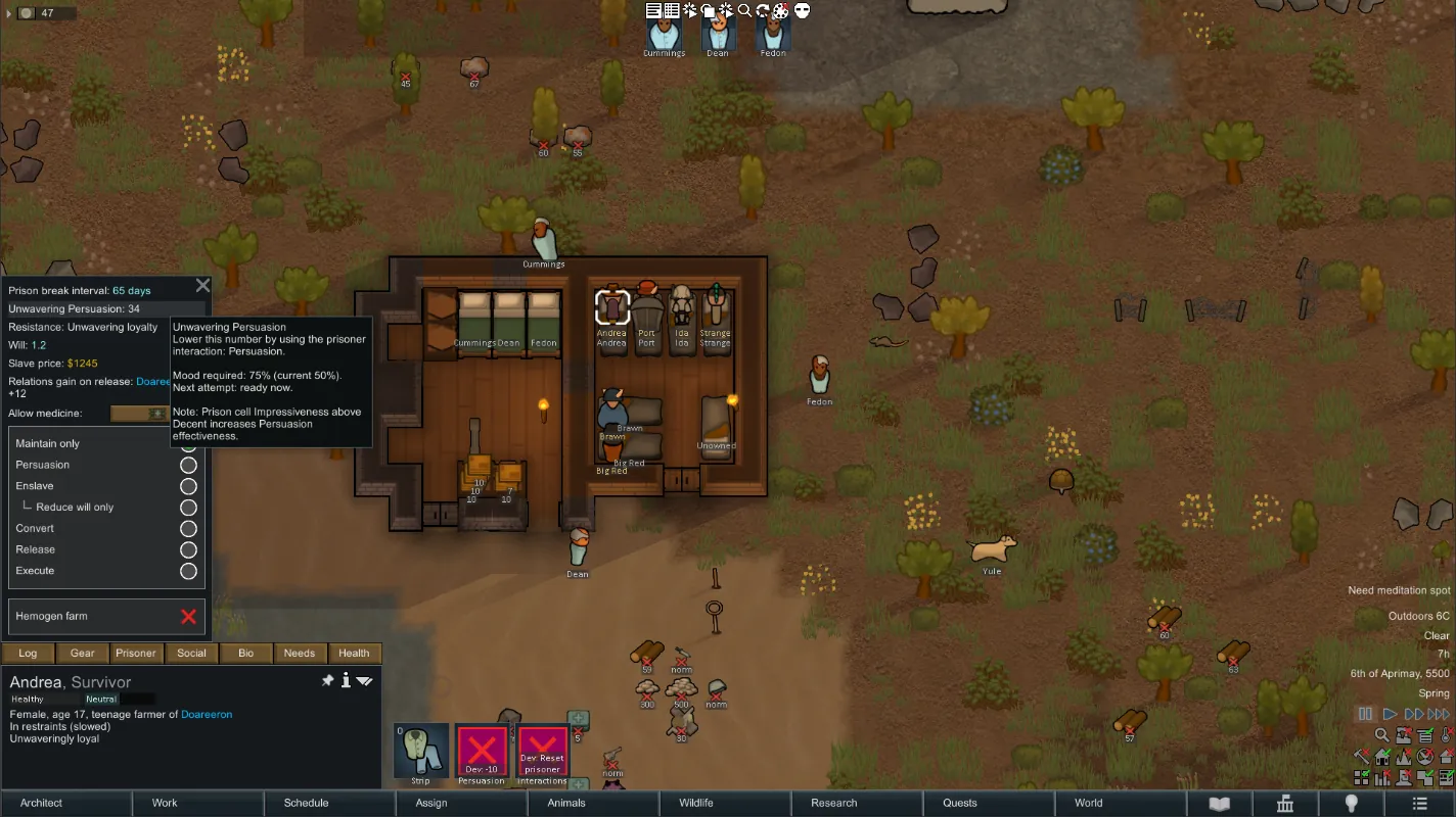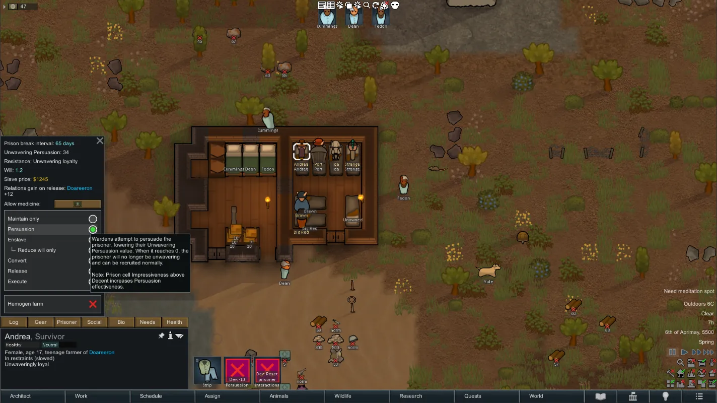 • Set the prisoner’s interaction to [b]Persuasion[/b]. Wardens try during normal prisoner rounds (vanilla timing).