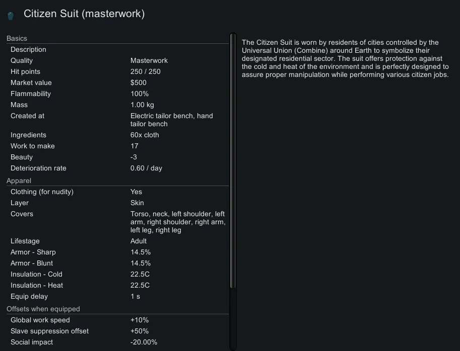 All above mentioned clothing will suppress slaves, enhance manipulation or movement speed and negate social impact.