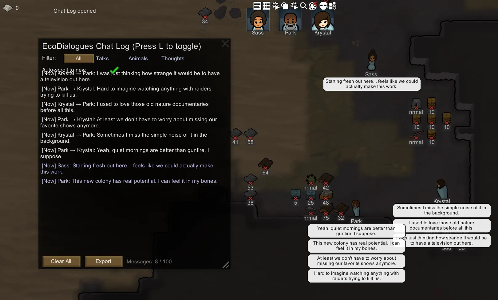 [b]EchoDialogues[/b] transforms your colony into a vibrant place full of authentic conversations. Your colonists will no longer be silent figures: they'll have [b]unique personalities[/b], [b]their own opinions[/b], and plenty to say about life on the rim.