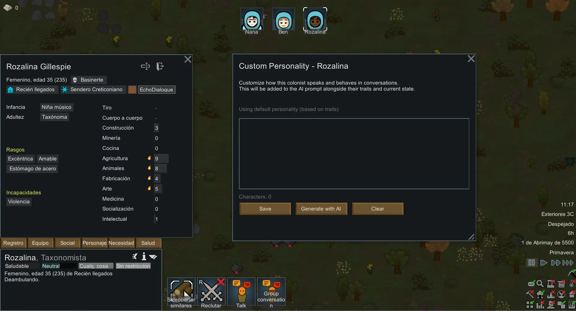 [*] [b]Custom prompts per colonist:[/b] In the "Character" tab you'll find a new button to assign unique personalities