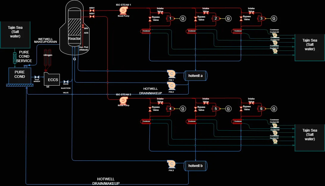 Hoshizora-Krail Nuclear Generating Station (Abbreviated as HK-NGS) is a 1.2MSWe electrical Nuclear Power Plant based at the Krail Oilworks platform, 2km from Tajin airport and seaport. The reactor type is a Boiling water reactor with a maximum thermal output of 3,500KsW and a maximum RPV pressure of 20 atmospheres (293psi, 20.2 Bar)