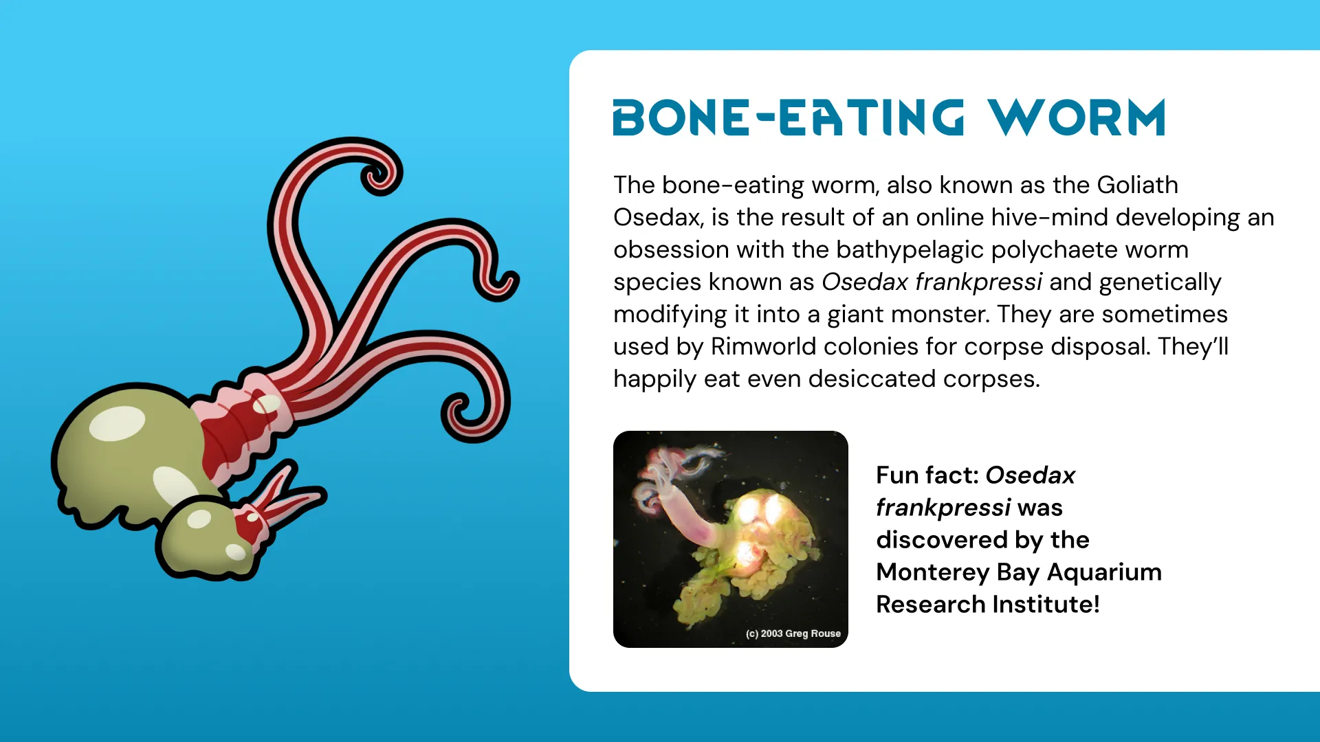 [*] Bone-eating worms can be found in most temperate and tropical coastal biomes. They will eat desiccated corpses!