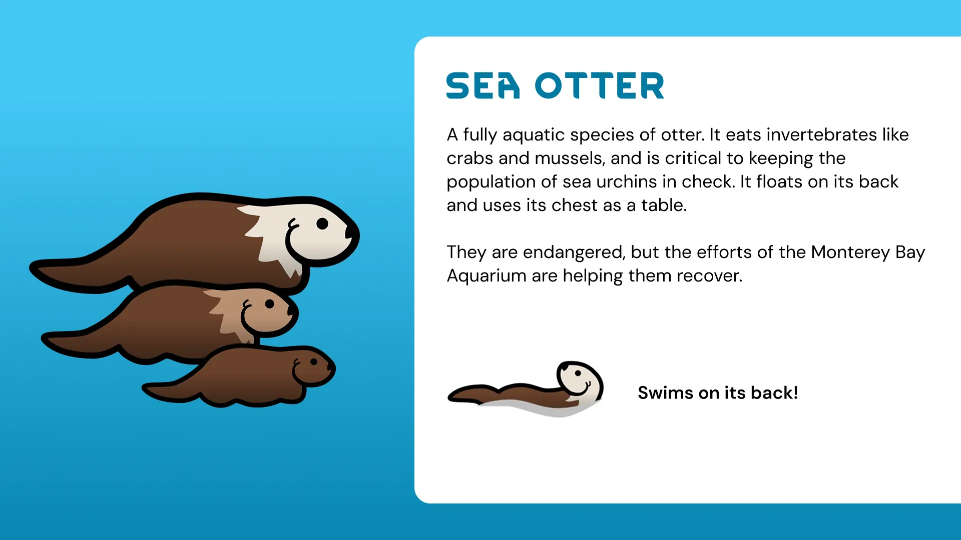 [*] Sea Otters can be found in most temperate and moderately cold coastal biomes. They have intermediate trainability.