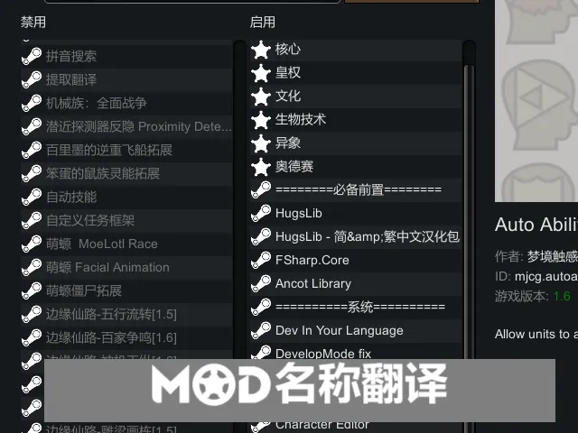 You need to first open Options - Mod Options, find "Mod Name Translation," and then select the proxy above (can be left blank) and the language (default is zh-CN, zh, which is the browser language set in the HTTPS protocol, so Steam will return the Chinese name. You can change it to your language, and if you don't know what to fill in, ask AI). After clicking the get button, if you have Developer Mode enabled, a log will pop up as shown in the image below (it is recommended to at least temporarily enable it to determine if the retrieval is complete): [img]https://images.steamusercontent.com/ugc/10038104747827829331/A04BCC50B587C48CD49D556E4227C0C0654E049B/?imw=5000&imh=5000&ima=fit&impolicy=Letterbox&imcolor=%23000000&letterbox=false[/img] Wait until the final "completed" prompt is displayed. At this point, the successfully retrieved names will appear below the mod options.