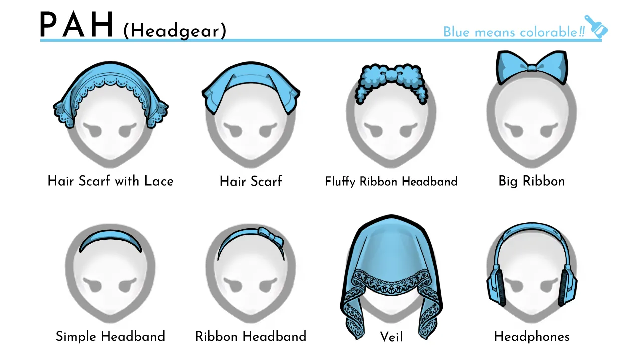 メガネ、カチューシャ、イヤリング、スカーフ、ヘアピンなど、顔周り装飾品を収録しています。
