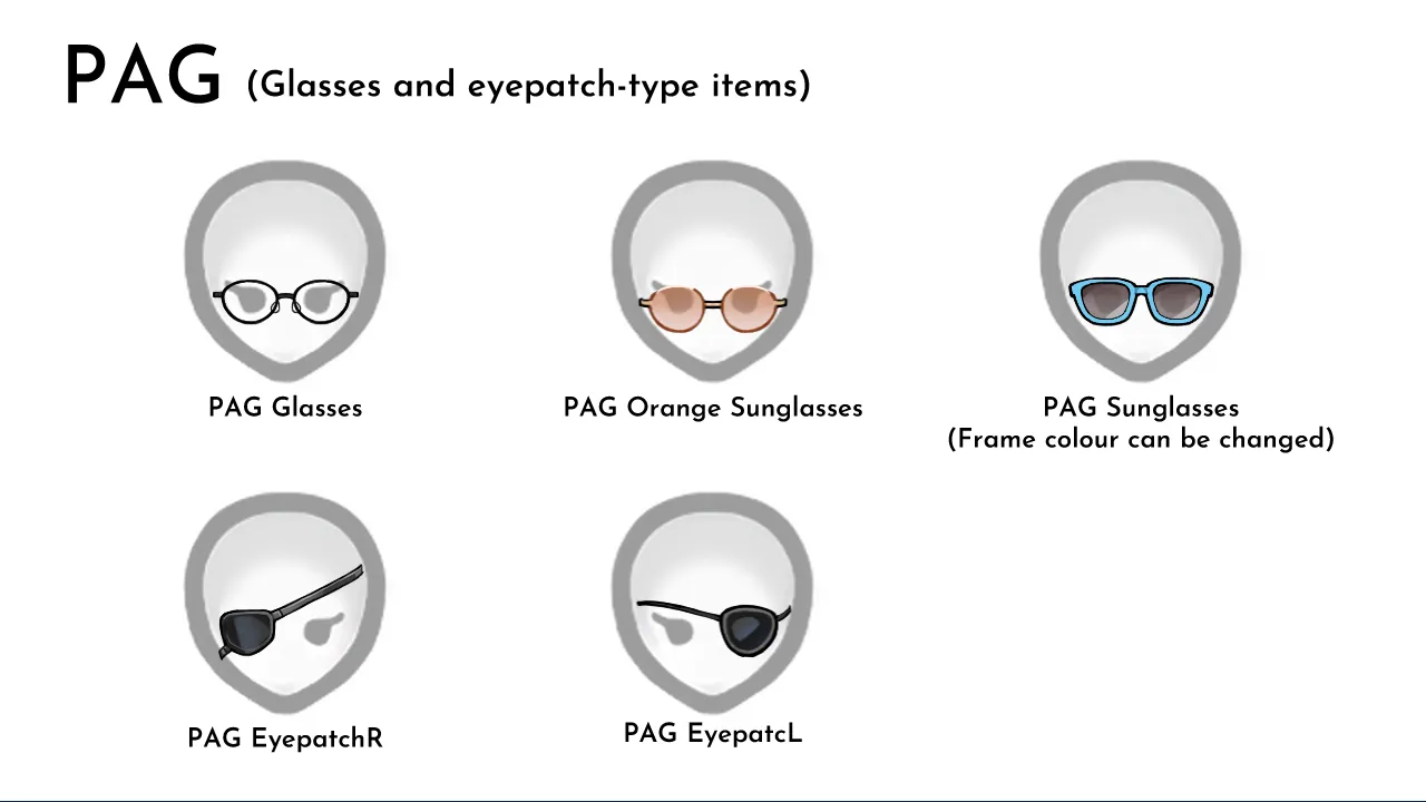 Glasses and eyepatch-type items. They offer minimal defense but do not affect vision. Eyepatches also do not impair vision.