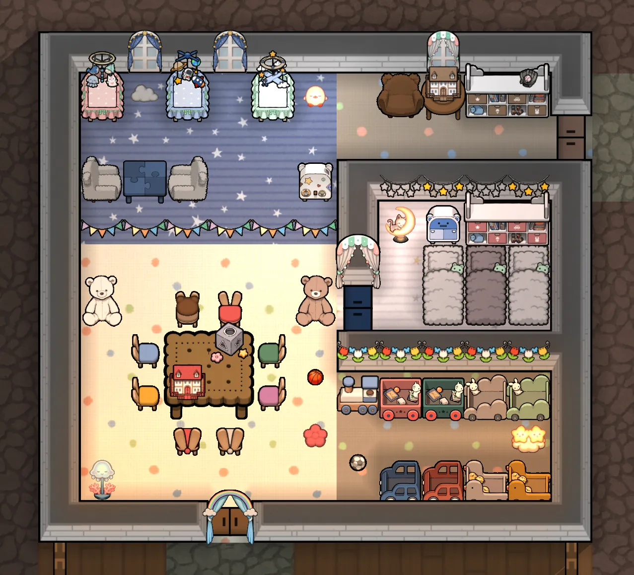 It's designed with a cute, whimsical style in mind—think character motifs, toys, and playful decorations.