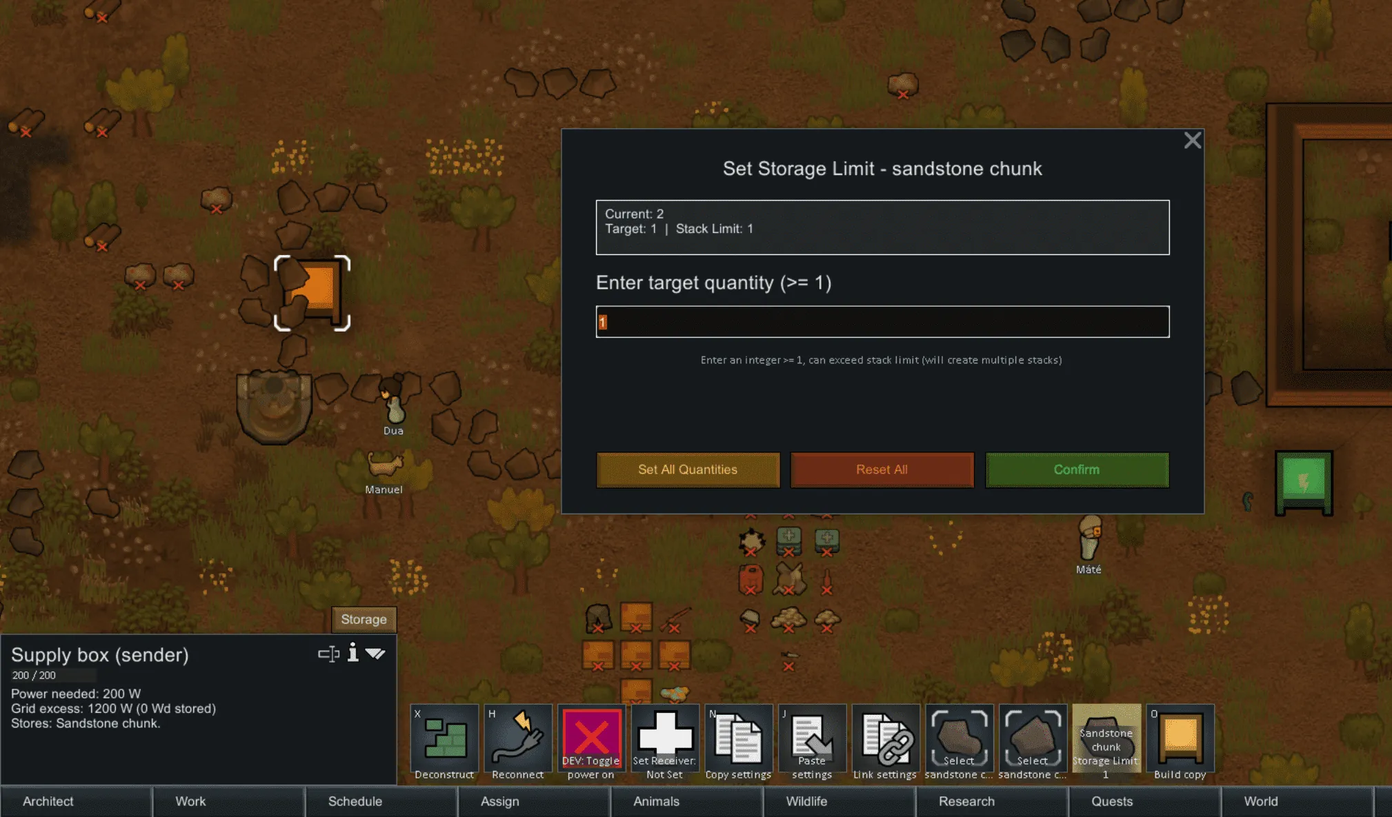 [*] [b]Quantity Limits[/b]: Sender box has item quantity restrictions; excess items are ejected when limits are reached, and further items are rejected to prevent over-stocking. Also prevents pawns from reorganizing and merging items to avoid hauling loops. Default is one stack per item type; receiver box has no such limit.