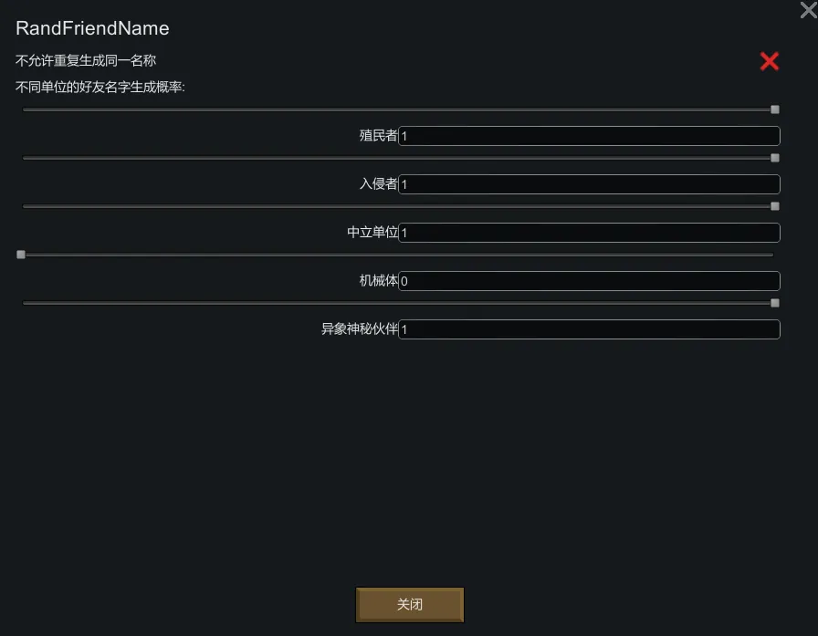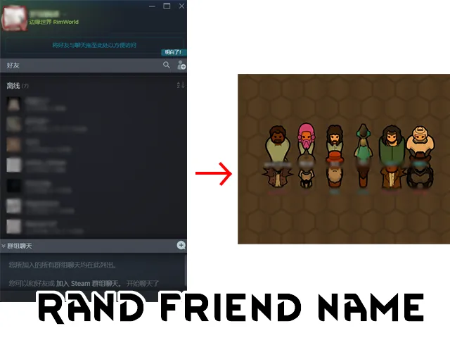 Settings (Features): You can adjust the probability of allowing duplicate names, and the probability of different units (colonists, enemies, neutral units, friendly mechanoids, or anomaly - mysterious partners (or called creeepy joiners?)) being generated with your friends' names. Please refer to the workshop images.