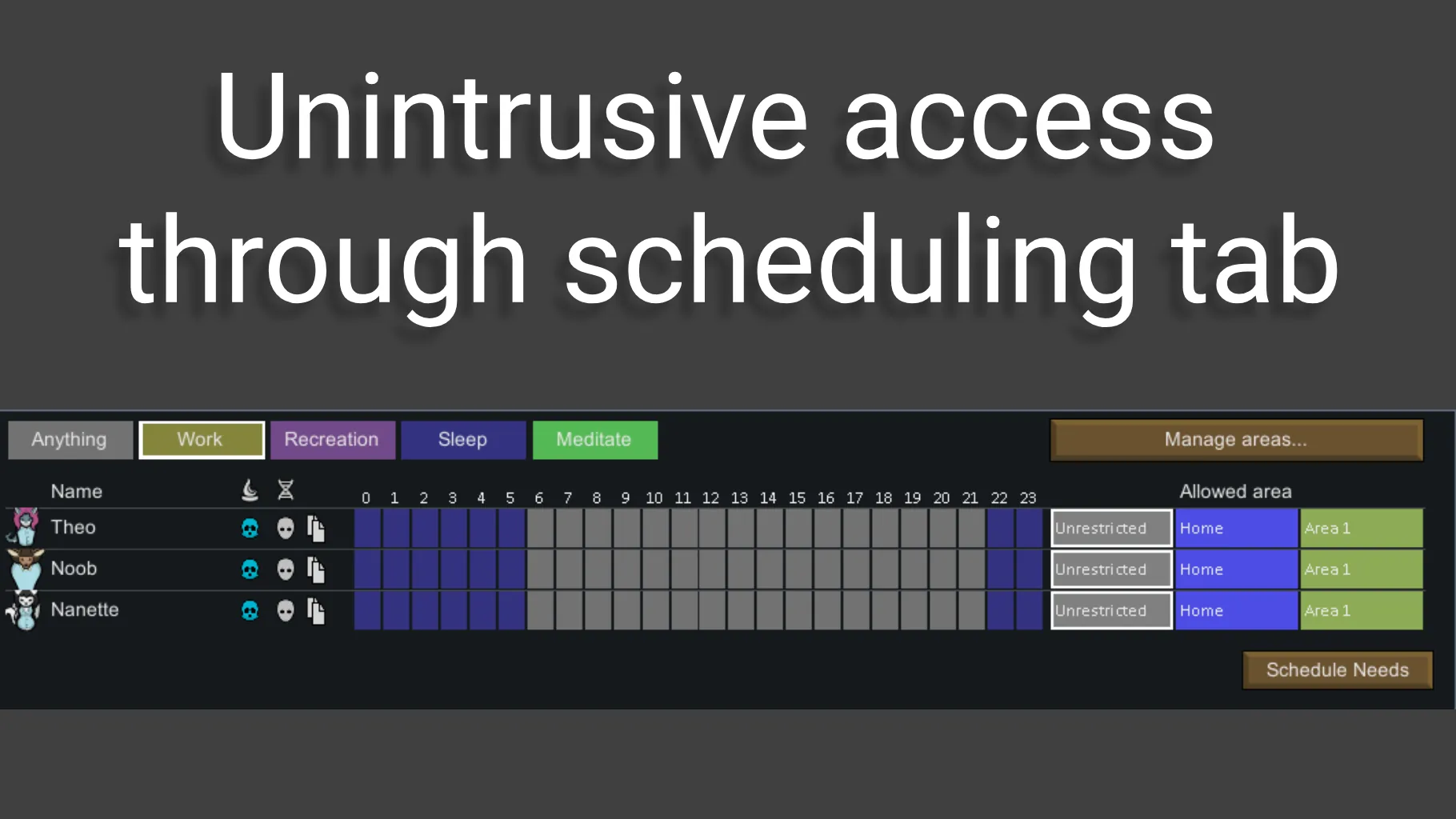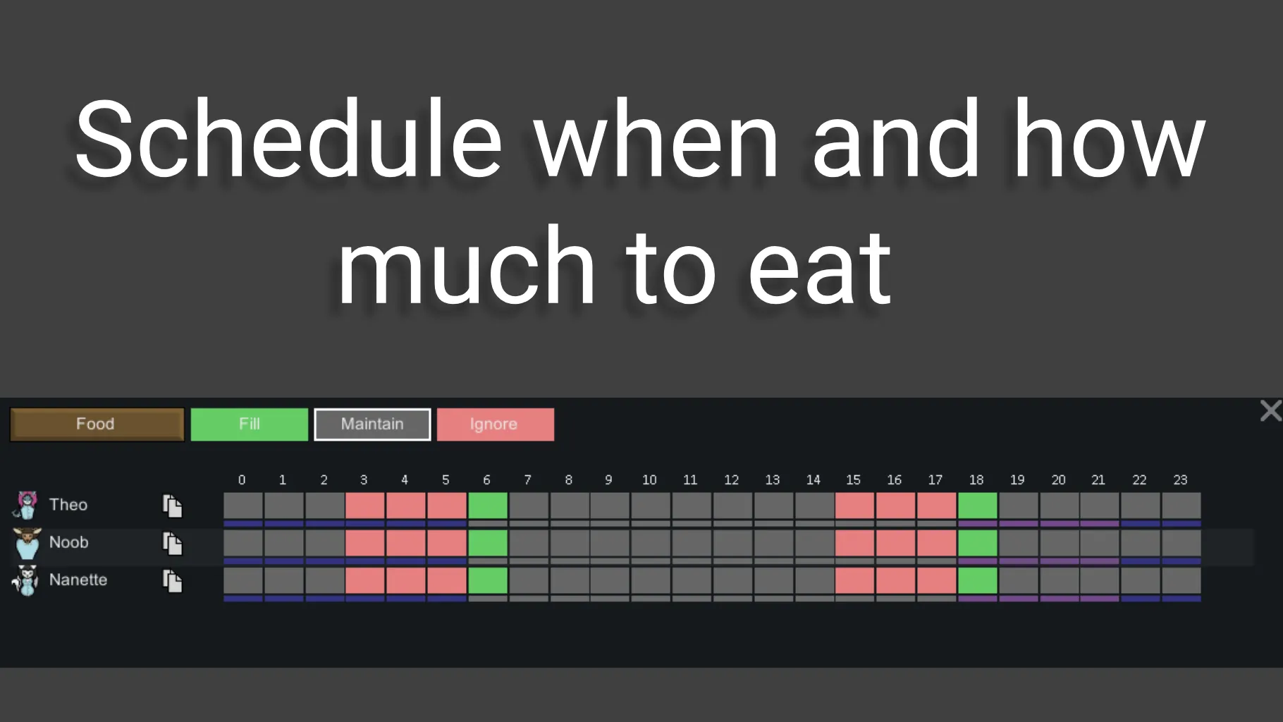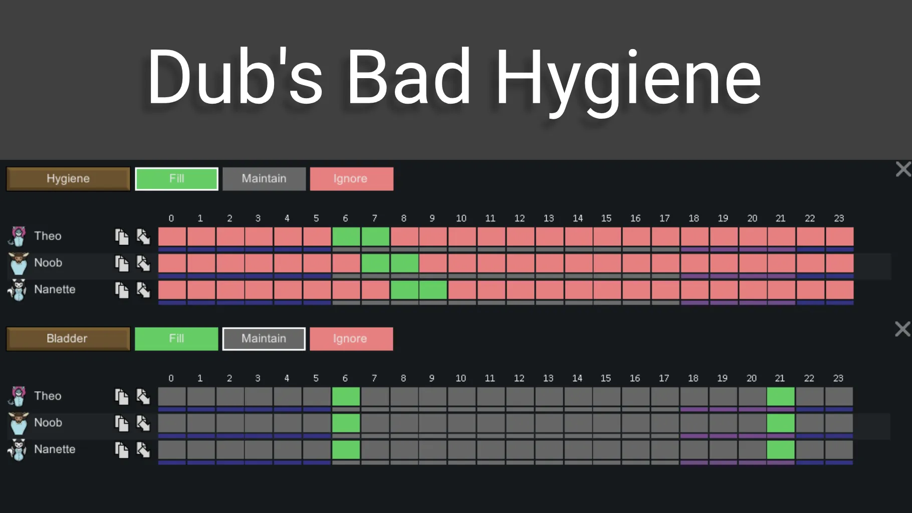 Make your colonist fill their needs bars at specific times. Supports Food need and Dubs Bad Hygiene needs.
