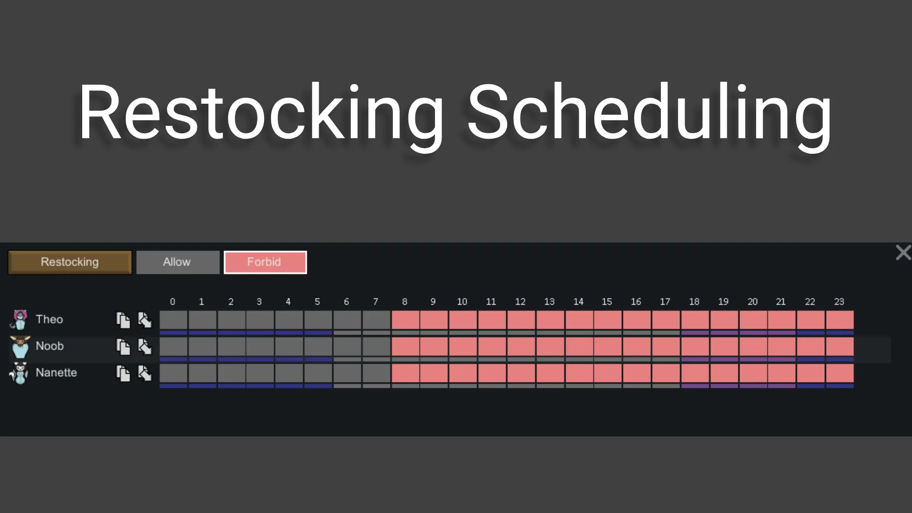 For restocking, it only has a simple scheduler with allow or forbid. This is to try to schedule when pawns should restock medicine and drugs.