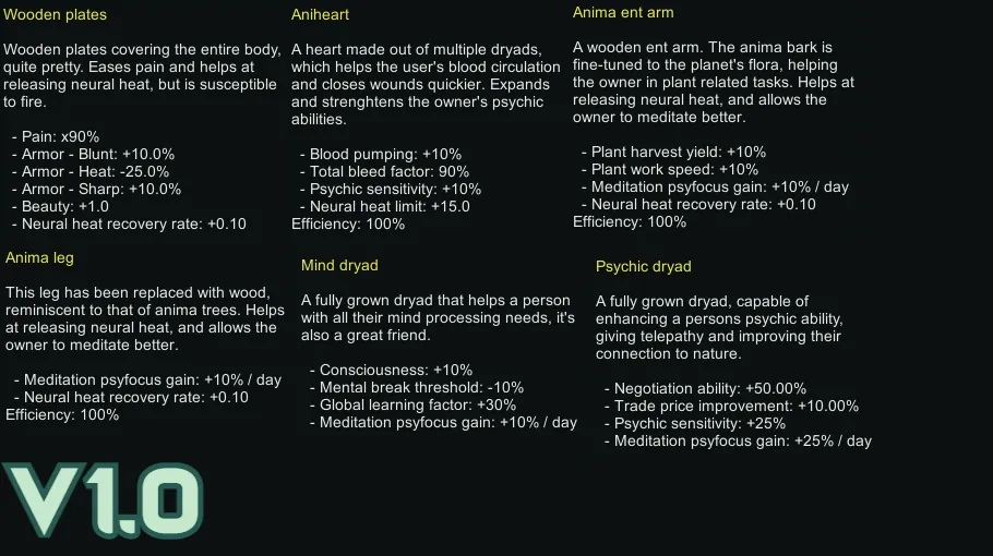 A fork, made with permission, of Seti's [url=https://steamcommunity.com/sharedfiles/filedetails/?id=2681074434&tscn=1666679892/]Anima Bionics[/url] that overhauls pretty much all stats, replacing the efficiency bonus with psycasting related buffs.
